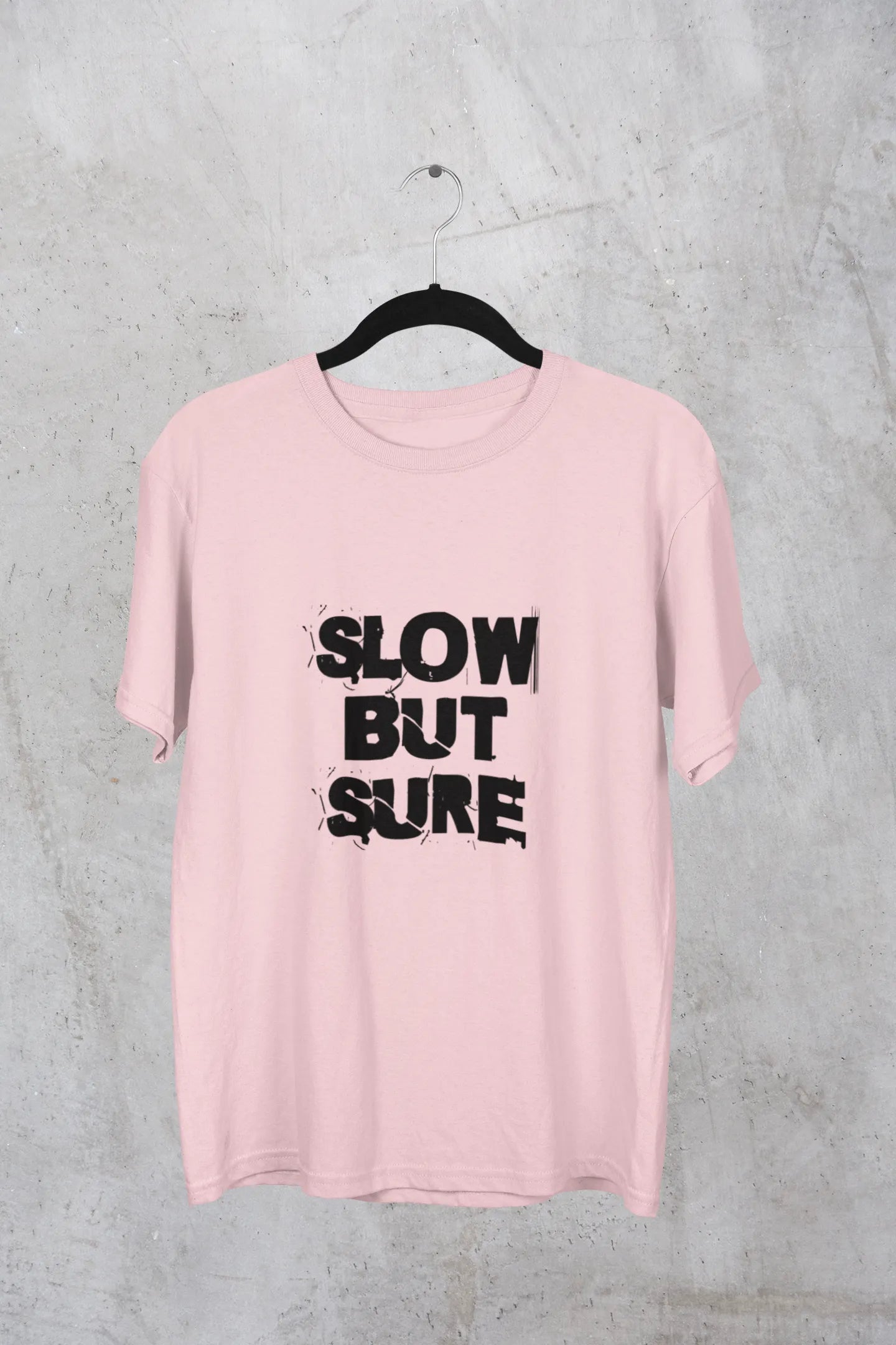 A relaxed-fit t-shirt featuring the phrase "Slow but Sure" in a smooth, flowing font. The design includes a cute turtle or snail illustration, symbolizing steady progress. Calming earth tones or soft pastels reflect patience, positivity, and quiet confidence in motion.