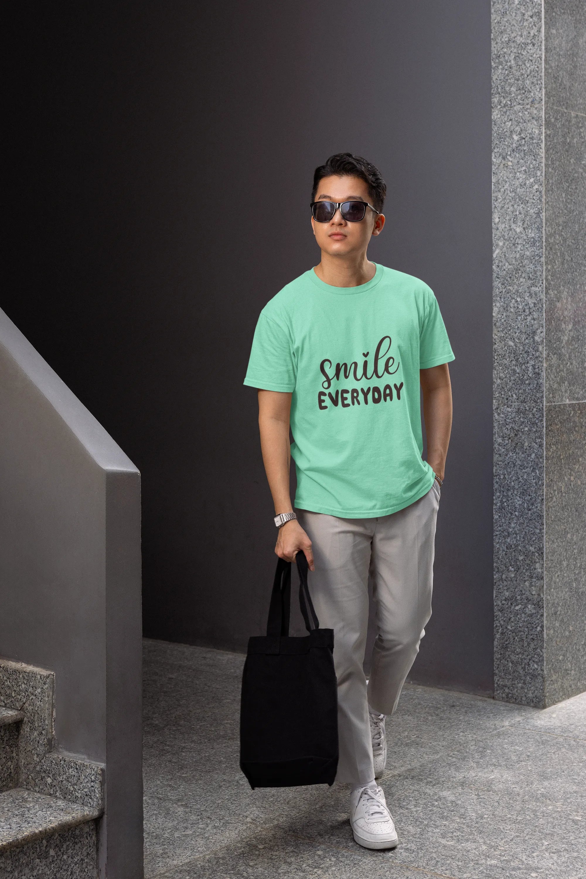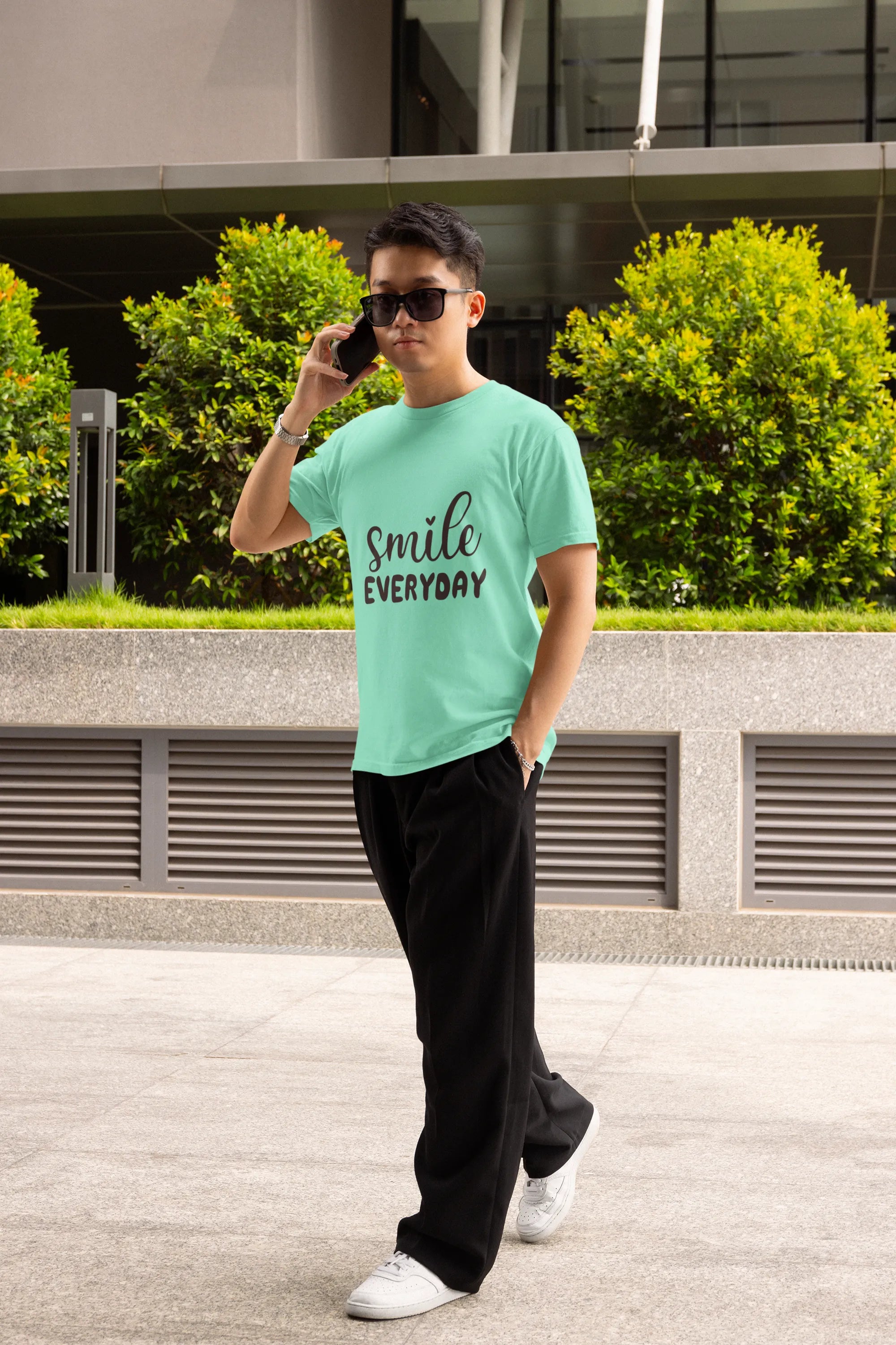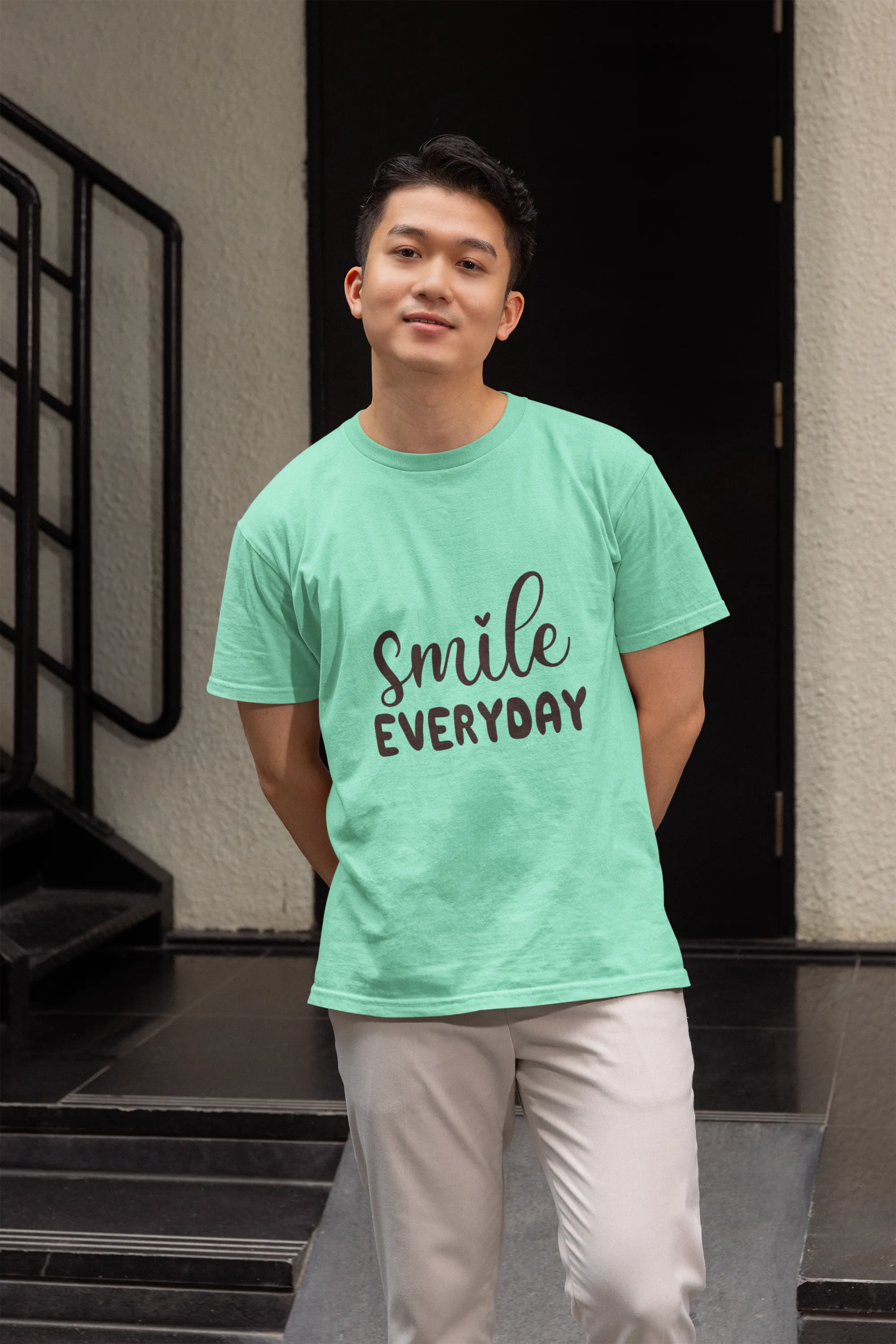 A minimal yet uplifting T-shirt design featuring the phrase "Smile Everyday" in a bold, playful font. Accentuated with a cheerful smiley face or sun illustration, the design radiates positivity, making it perfect for casual wear and spreading good vibes.