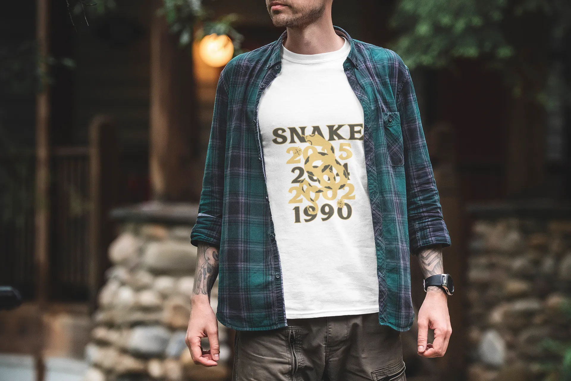 Person wearing a white t-shirt with 'Snake 1990' design in a forest setting