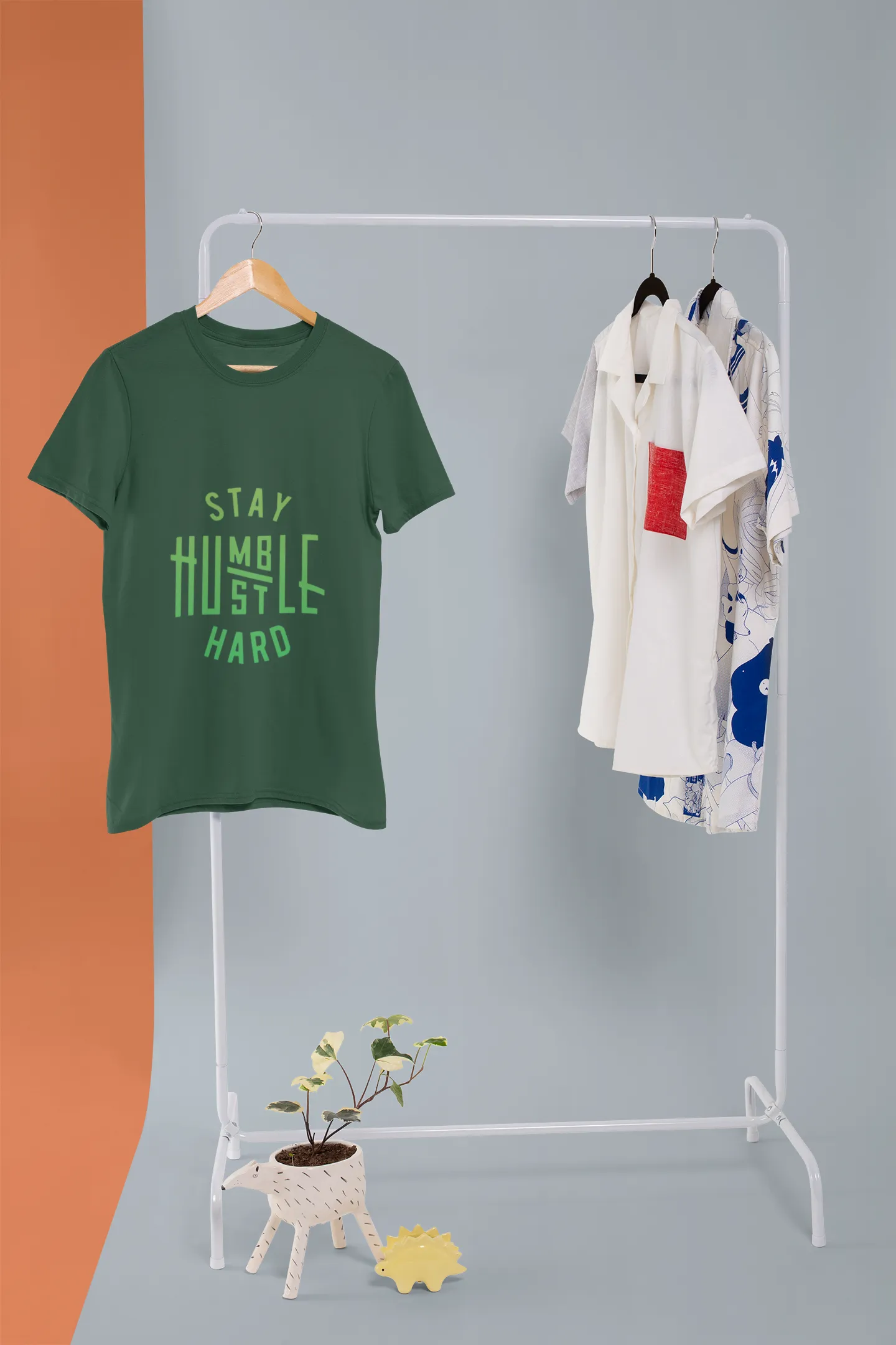 A minimalist T-shirt design featuring the phrase "Stay Humble" in elegant, hand-lettered script. Set against a clean background, the design radiates simplicity and grace, serving as a daily reminder to embrace humility with style and confidence.