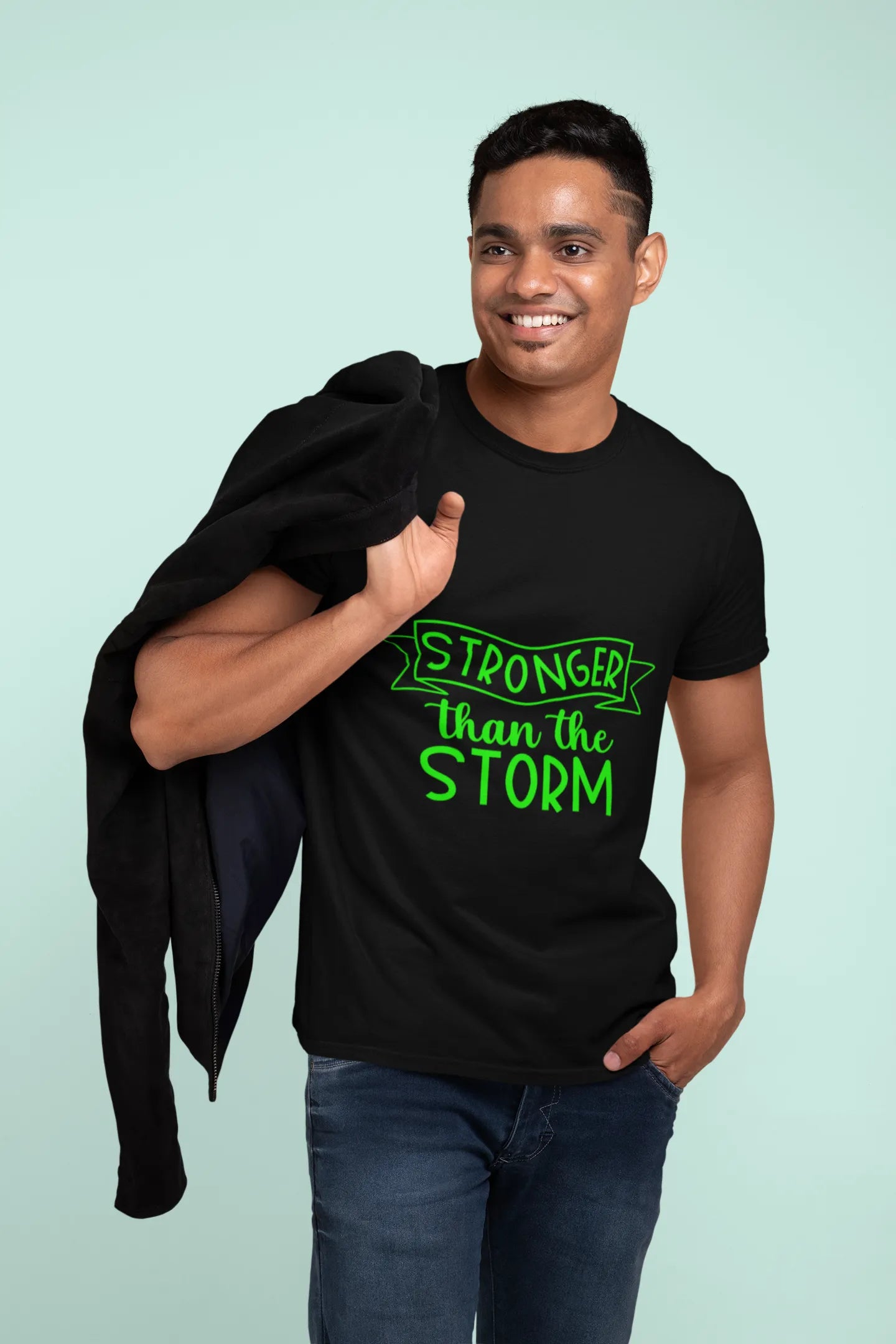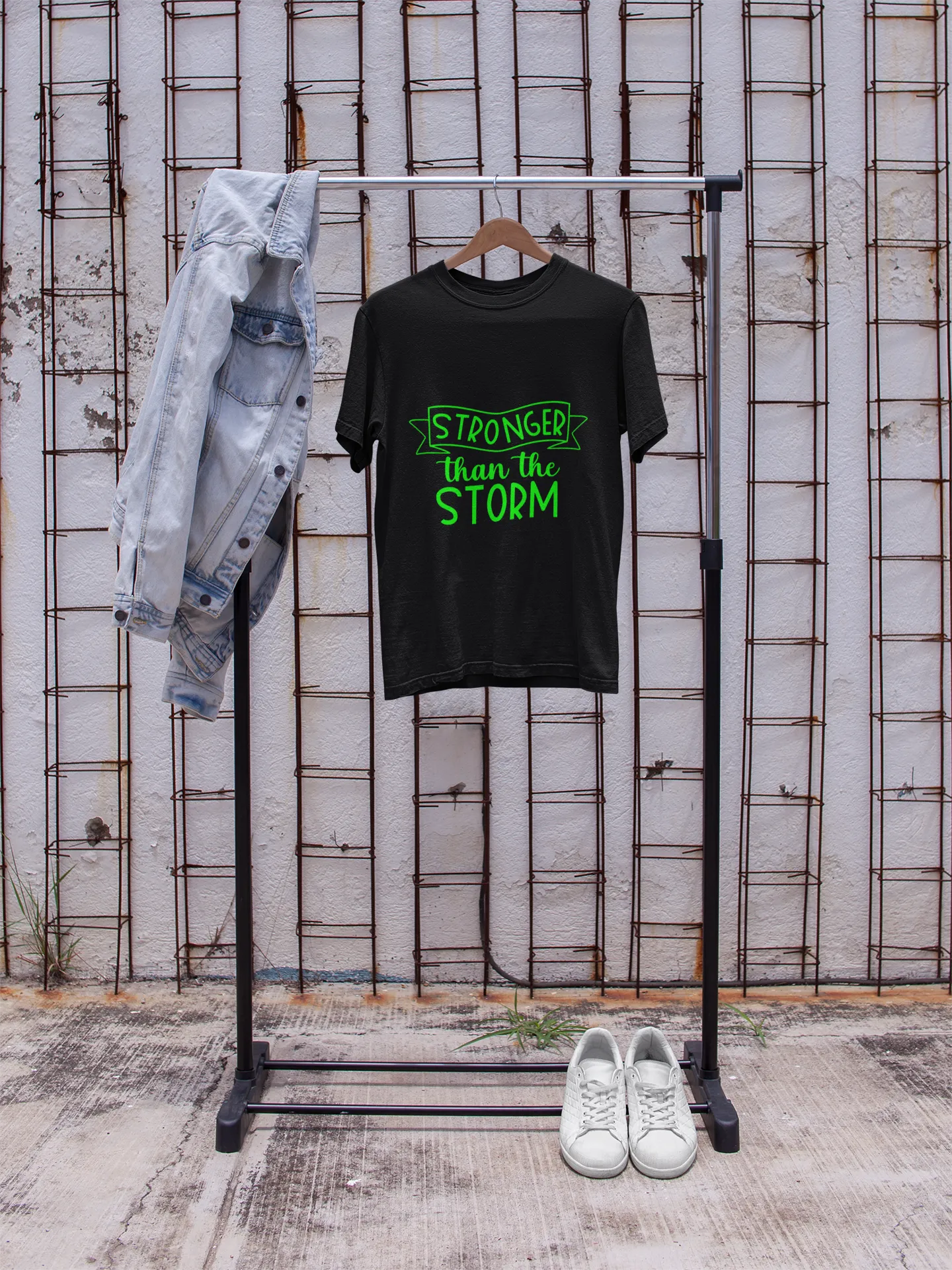 A powerful T-shirt design with "Stronger Than The Storm" in bold, dynamic typography. The text is complemented by a stormy background with lightning or waves, symbolizing resilience. A strong, uplifting design perfect for those who overcome challenges with determination.