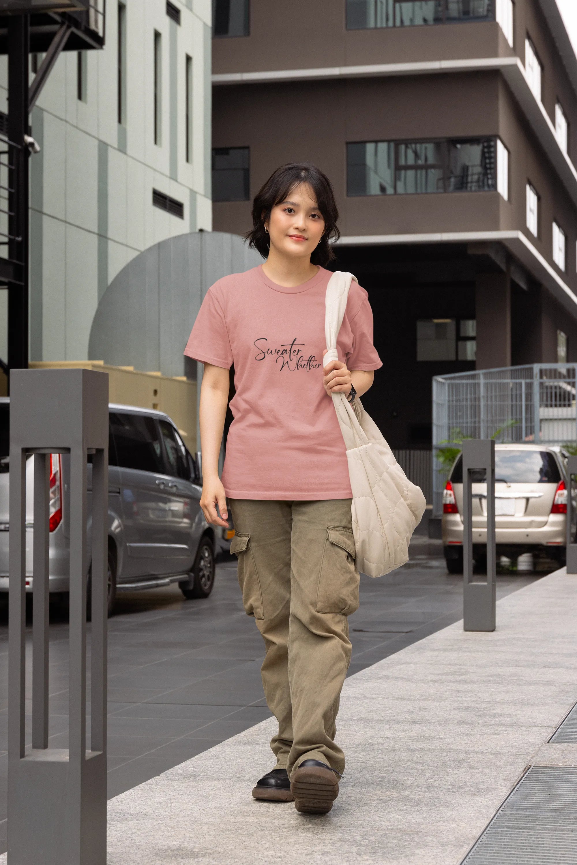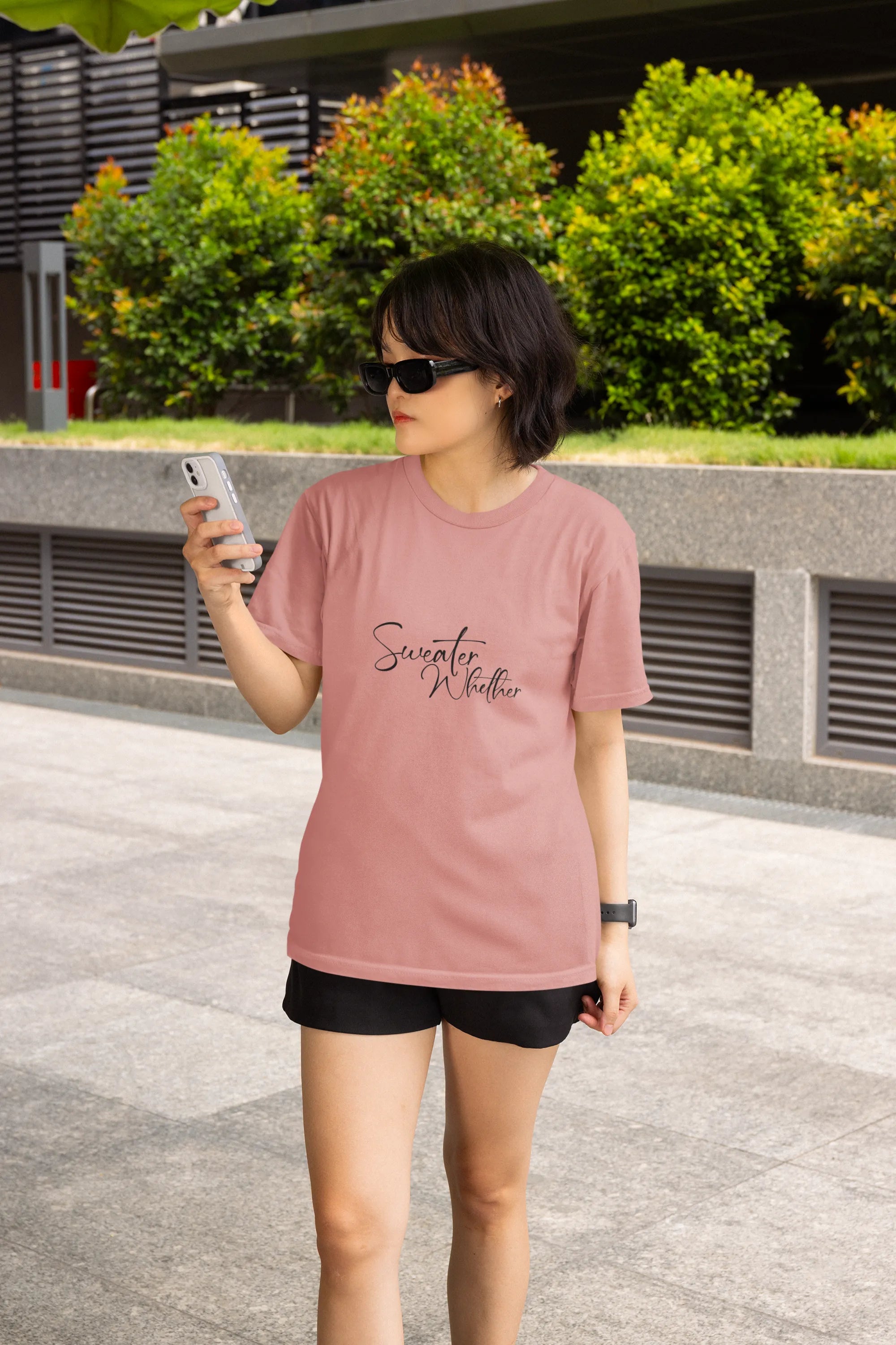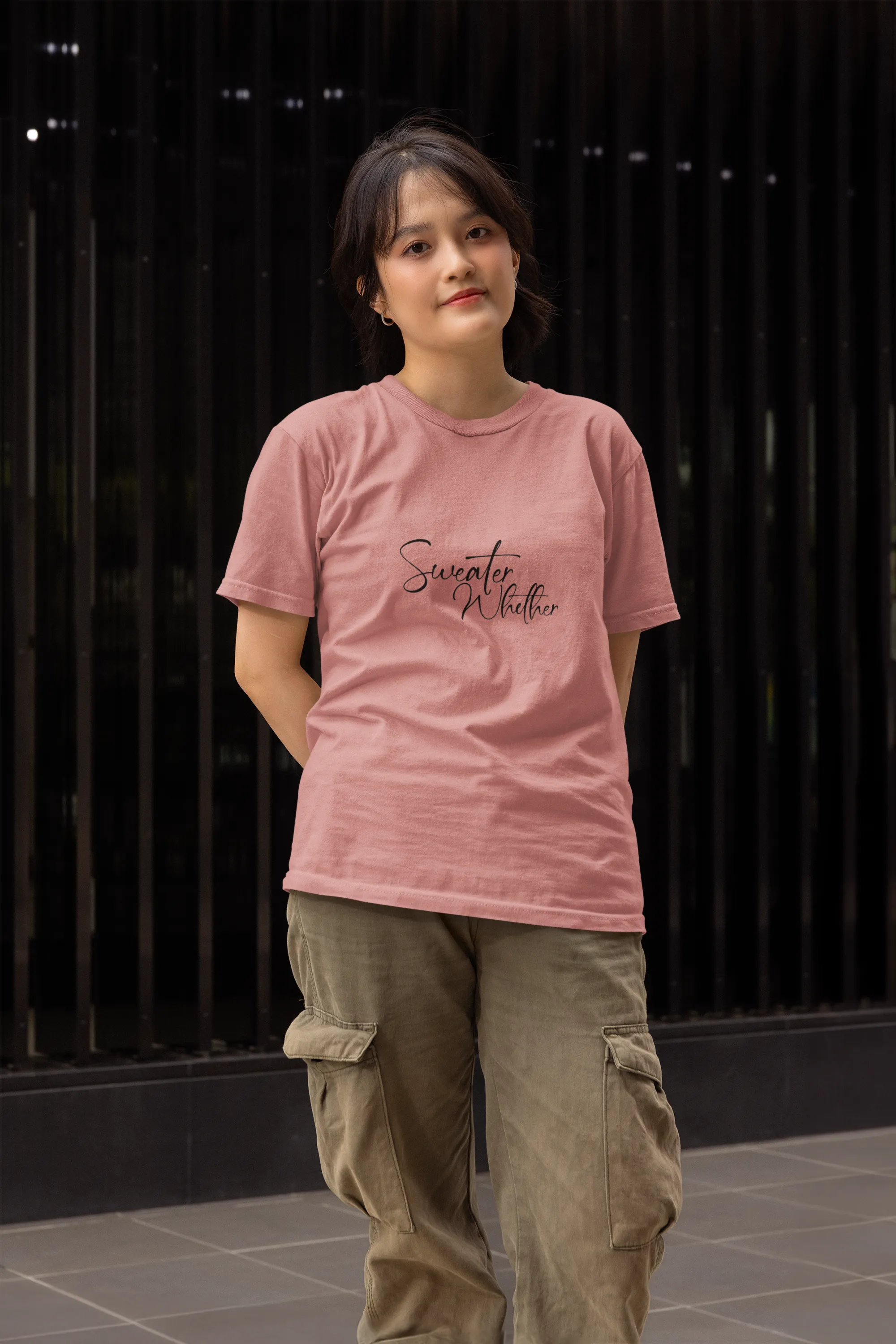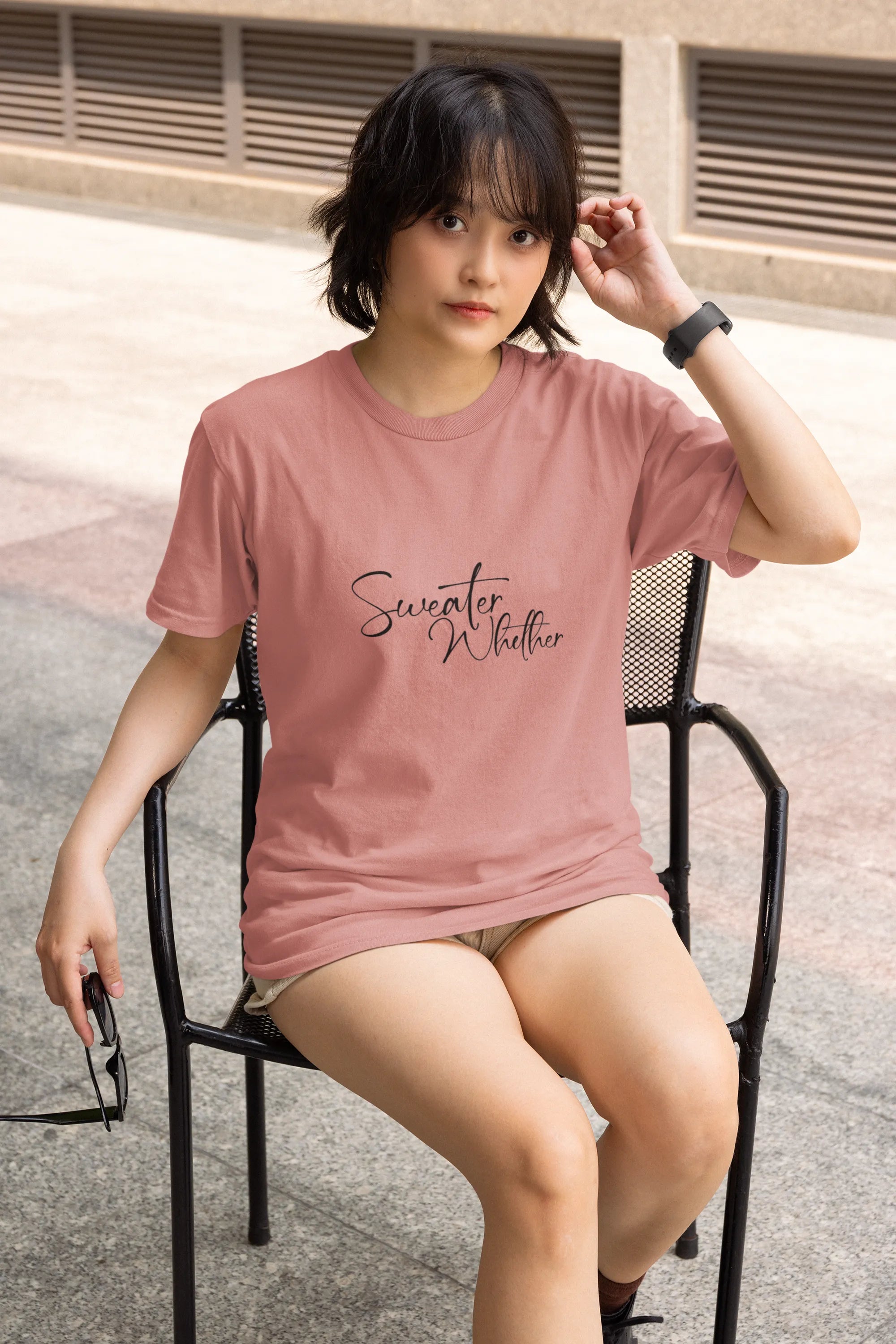 A cozy and playful T-shirt (or sweater) design featuring the phrase “Sweater Weather” in warm, whimsical typography. Embellished with autumn leaves, mugs of cocoa, or chilly wind motifs, it perfectly captures the comfort and charm of crisp, cozy days and fall vibes.