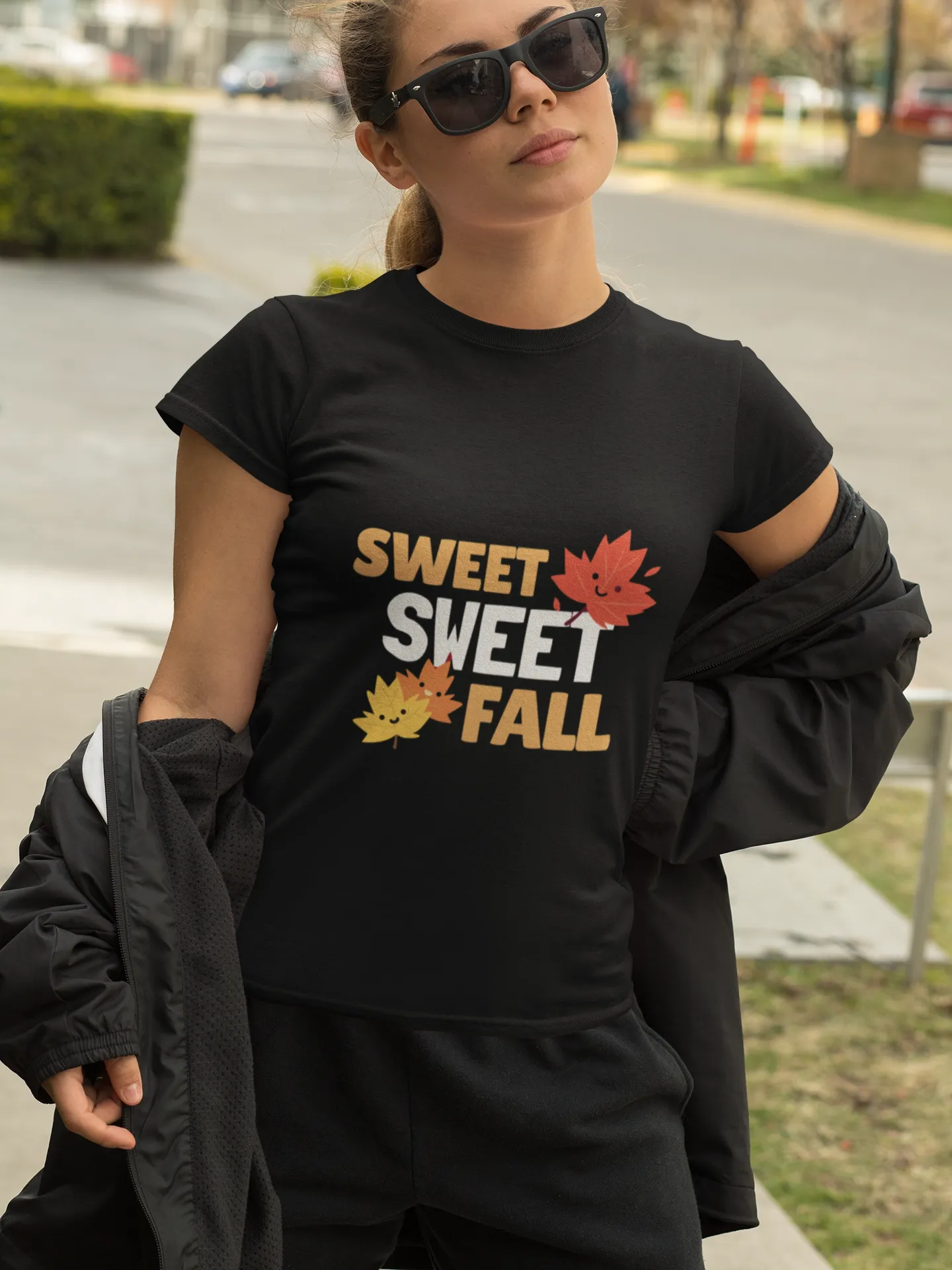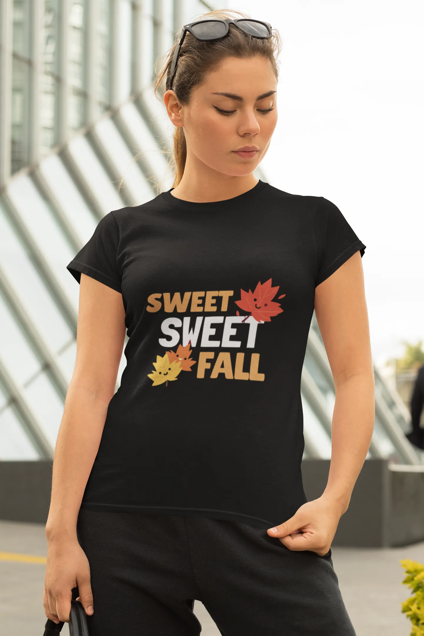 A cozy and charming T-shirt design featuring the phrase “Sweet Fall” in warm, whimsical typography. Accented with autumn leaves, pumpkins, and acorns in shades of orange, gold, and brown, it captures the gentle, nostalgic beauty of the fall season — perfect for lovers of crisp air and cozy vibes.