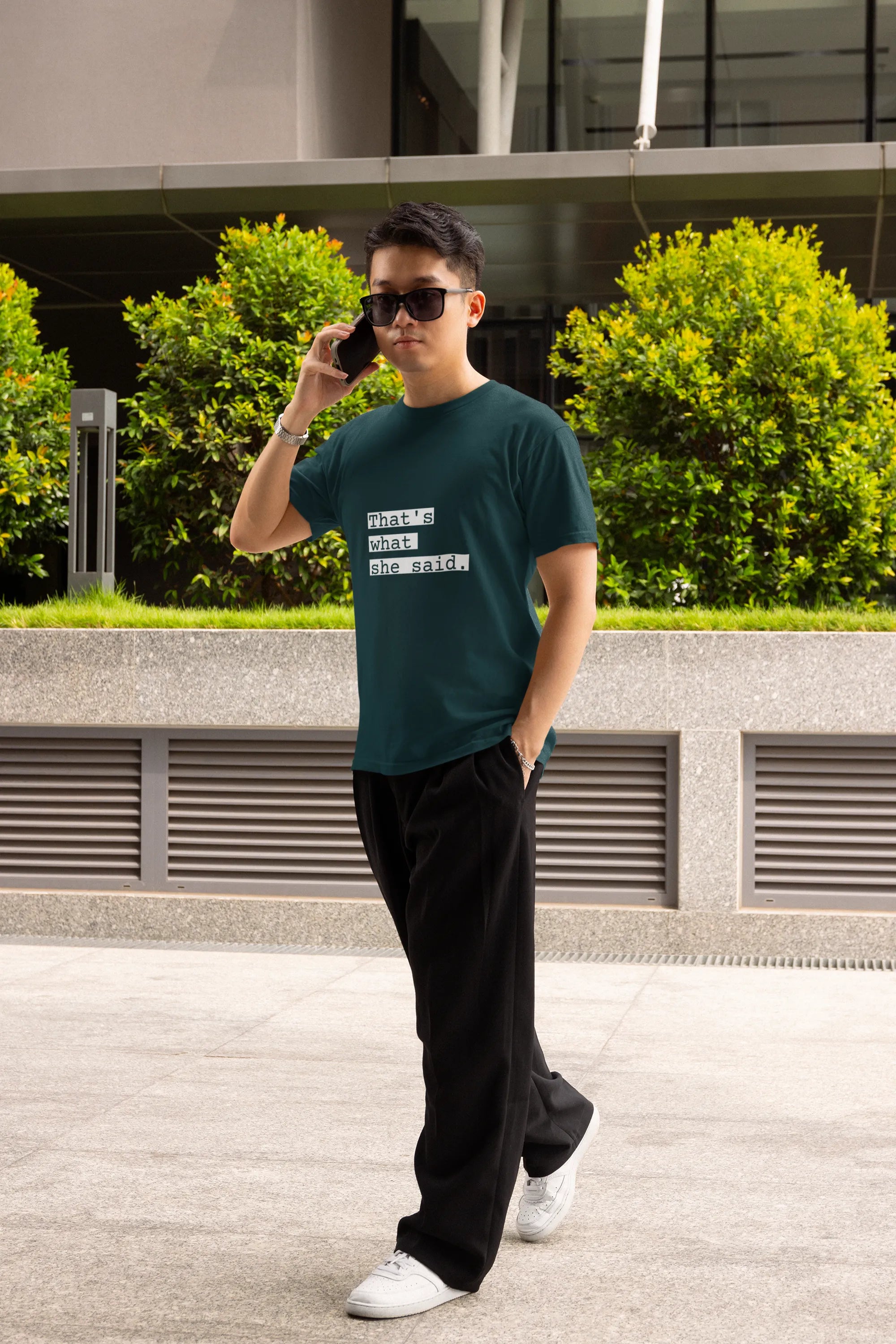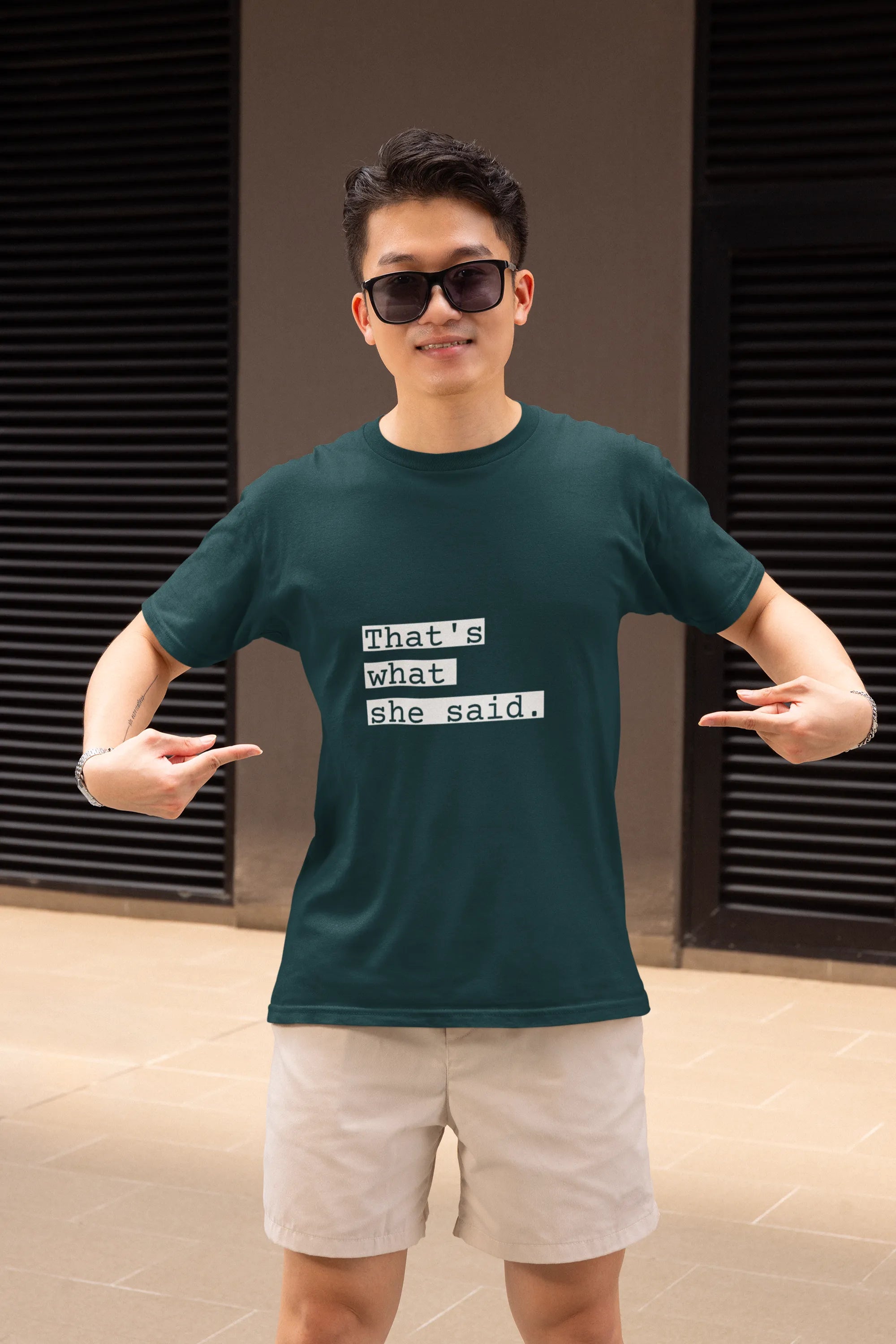 This T-shirt design brings cheeky humor to life with the classic phrase That's What She Said. Bold, playful, and unmistakably witty, it’s a nod to sarcasm lovers and joke masters. Perfect for those who enjoy a good laugh and clever comebacks.