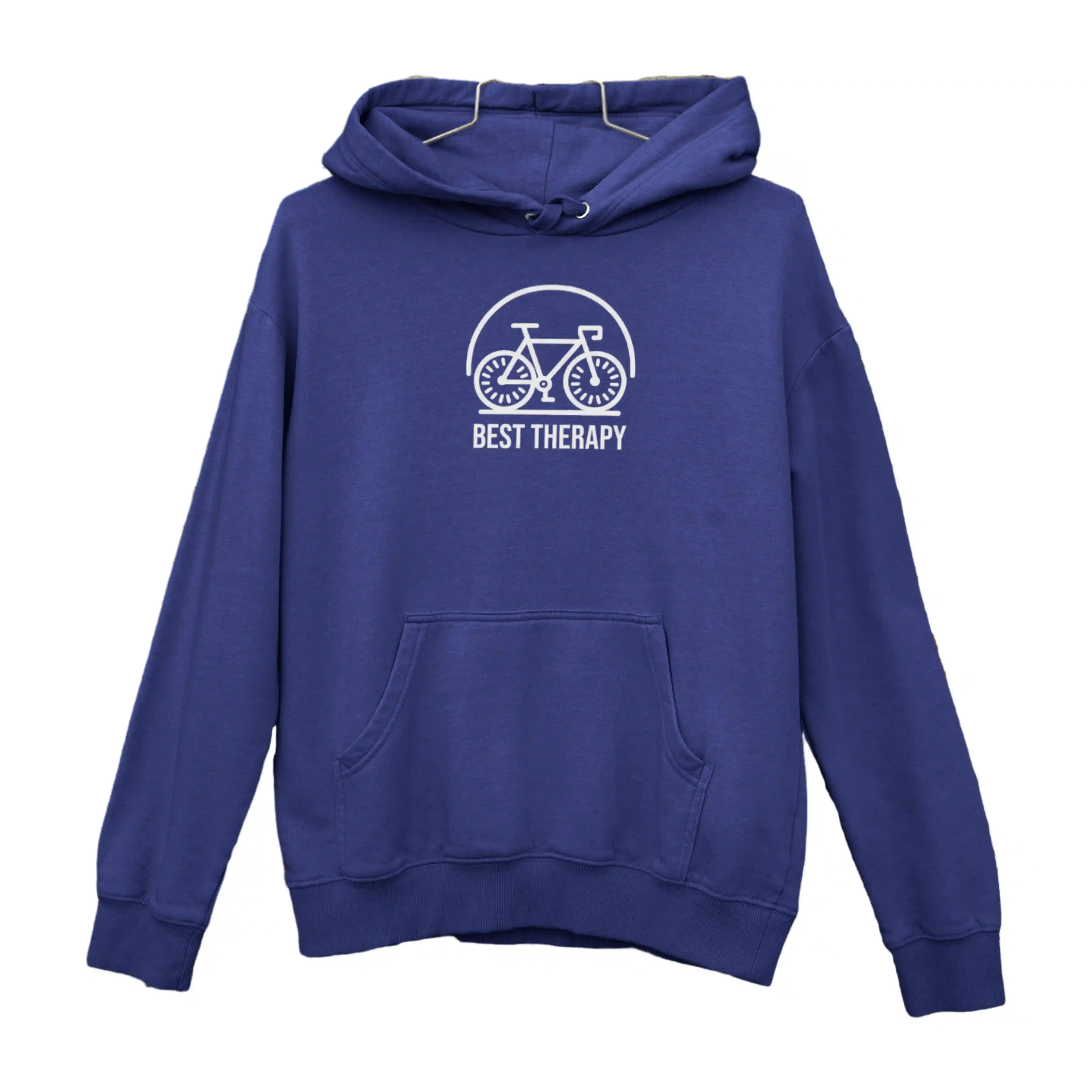 Man wearing a blue hoodie with a bicycle graphic and text on a white background