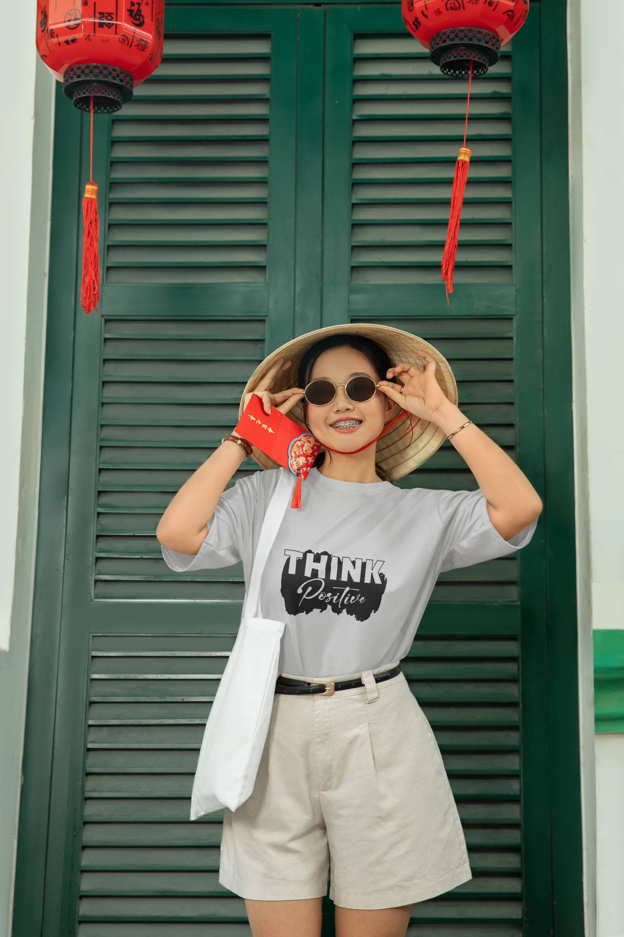 White t-shirt with 'Think Positive' text on a tree trunk