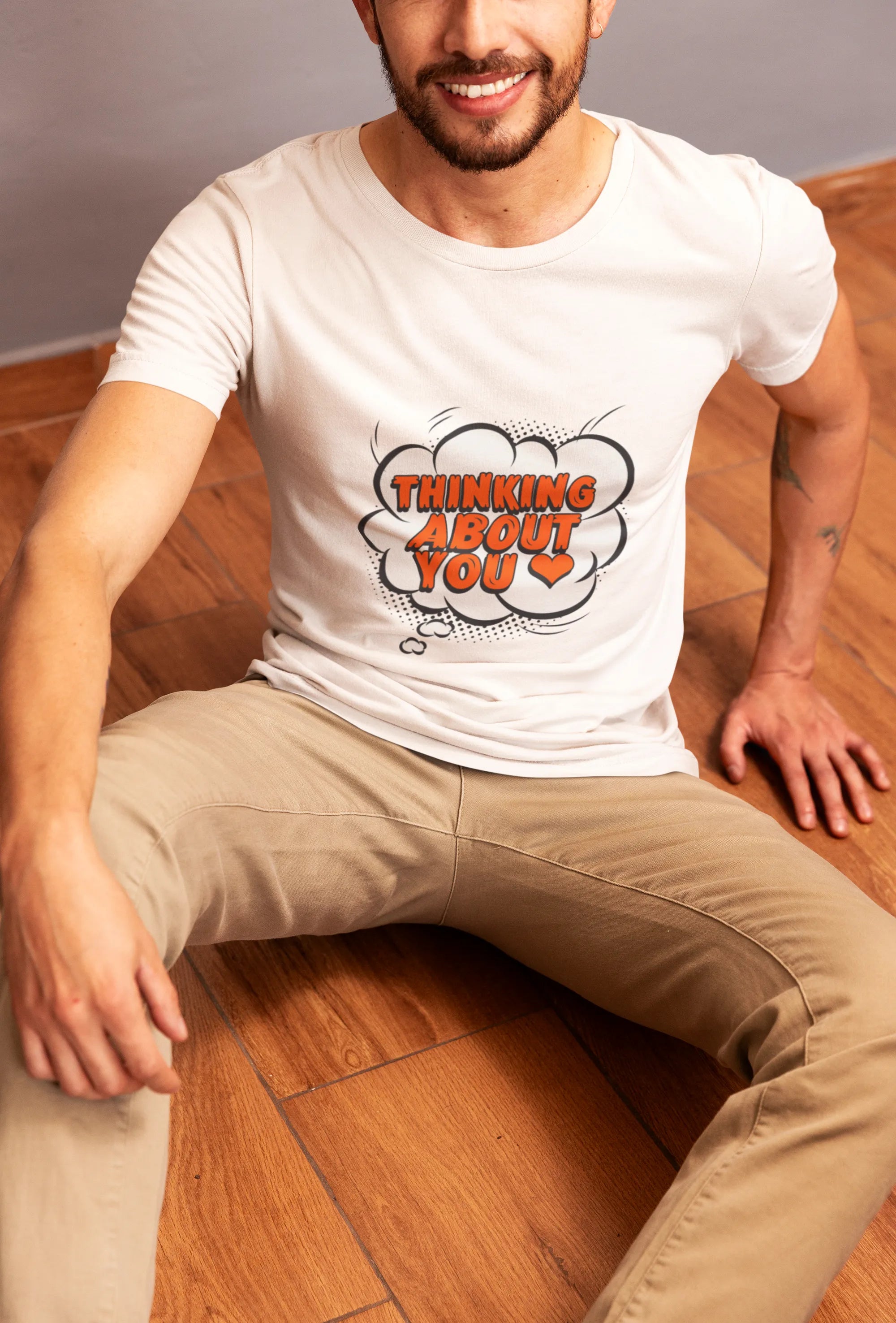 The "Thinking About You" T-shirt design features a heartfelt, dreamy aesthetic with elegant typography, soft pastels, or a minimalist sketch of a thought bubble or heart. Perfect for expressing emotions, it captures nostalgia, love, and deep connection in a stylish and meaningful way.