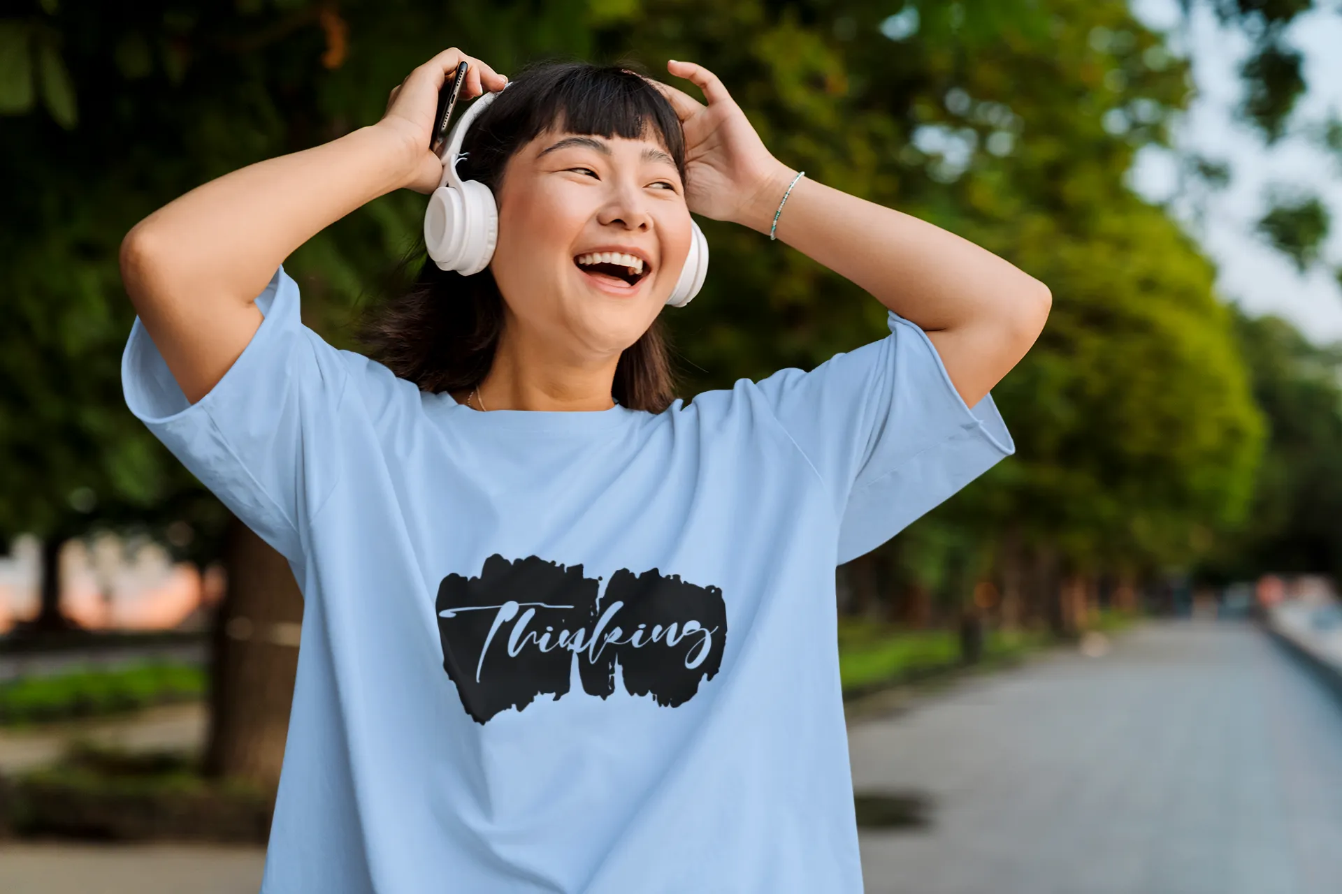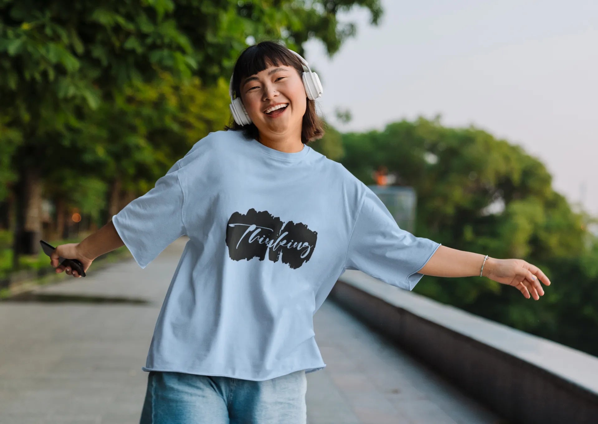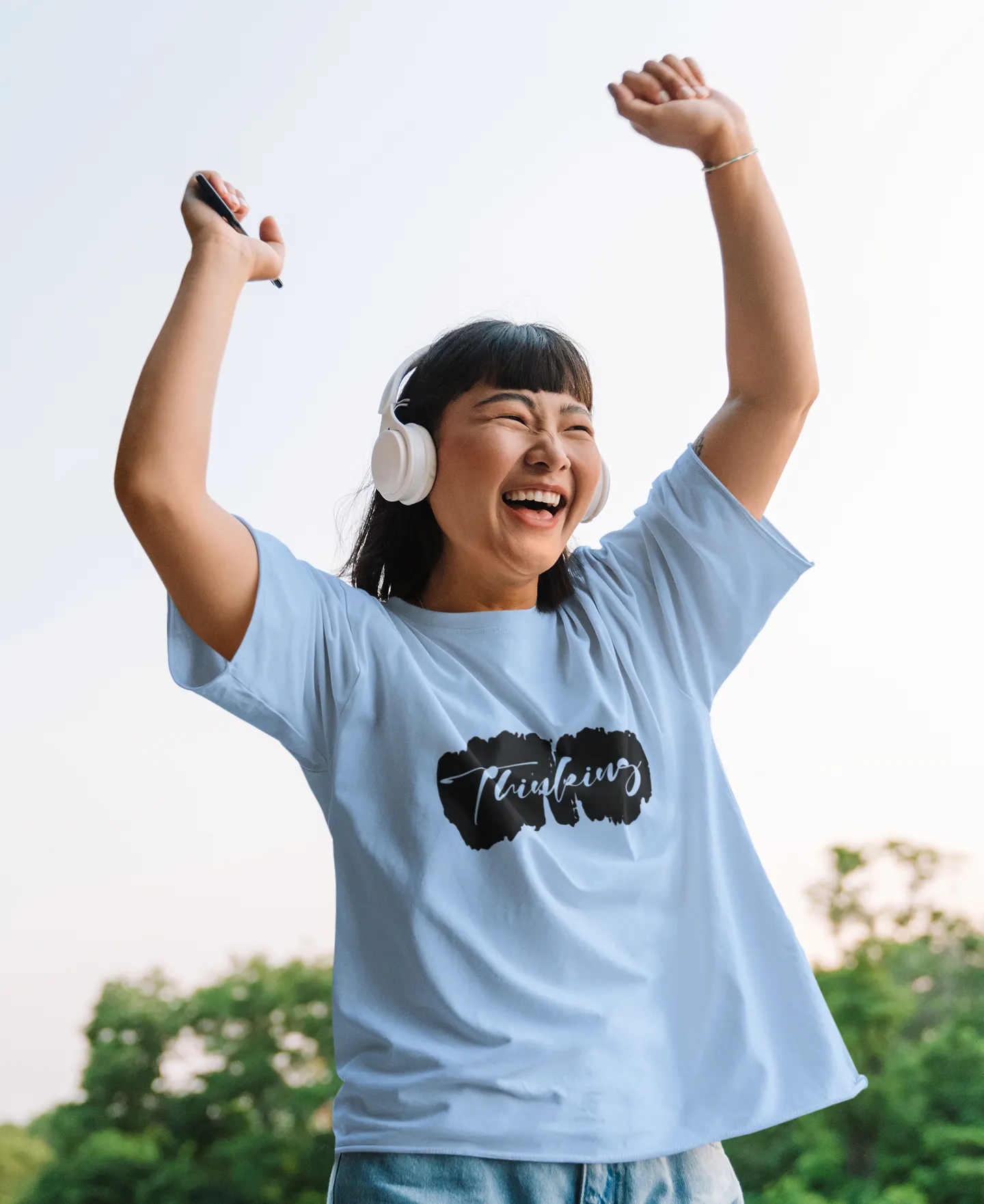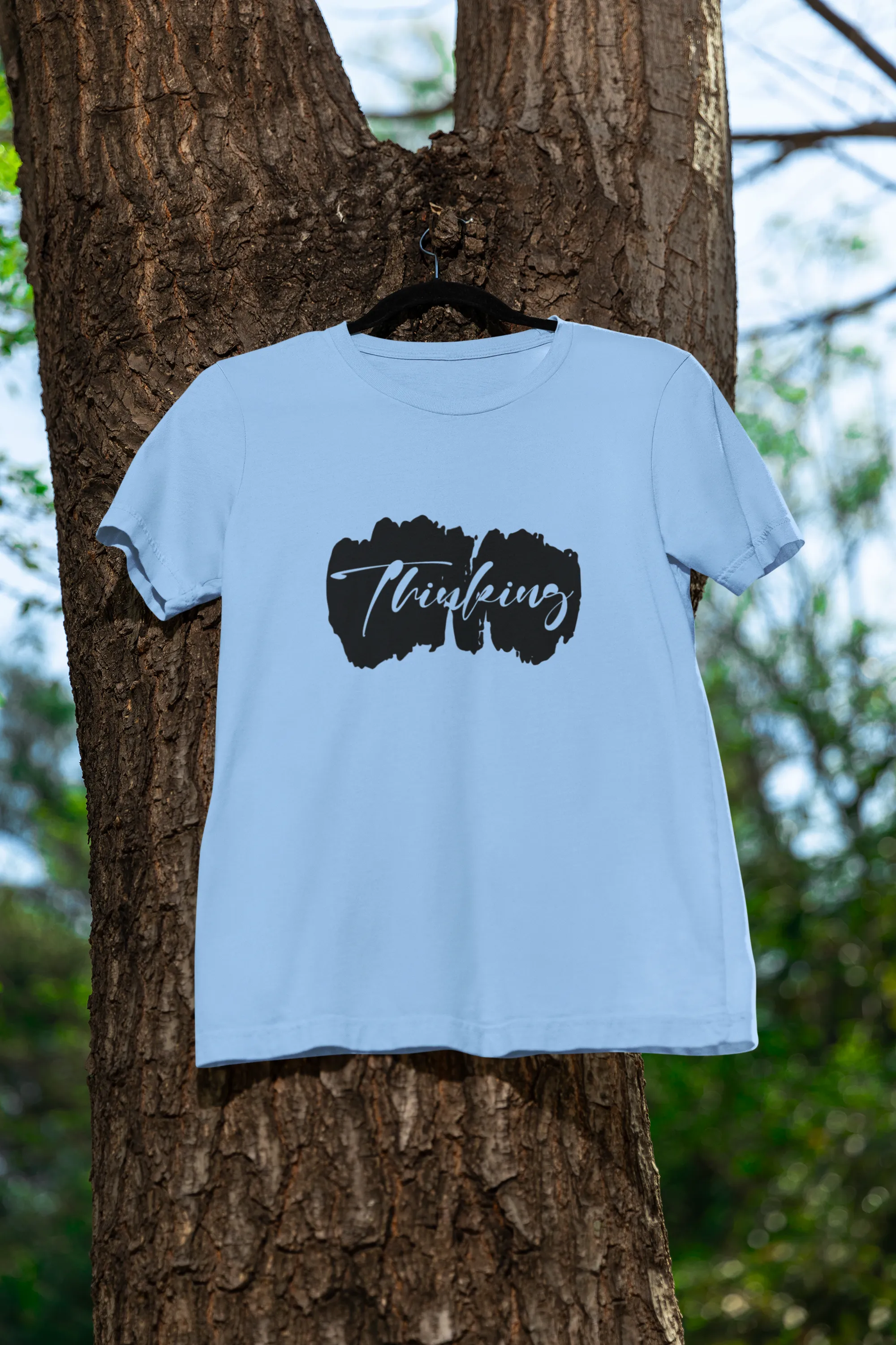 A thoughtful T-shirt design showcasing the word “Thinking” in soft, flowing typography, paired with subtle abstract elements like clouds or thought bubbles. It captures a reflective mood, perfect for deep thinkers, creatives, or anyone who enjoys quiet moments of introspection.