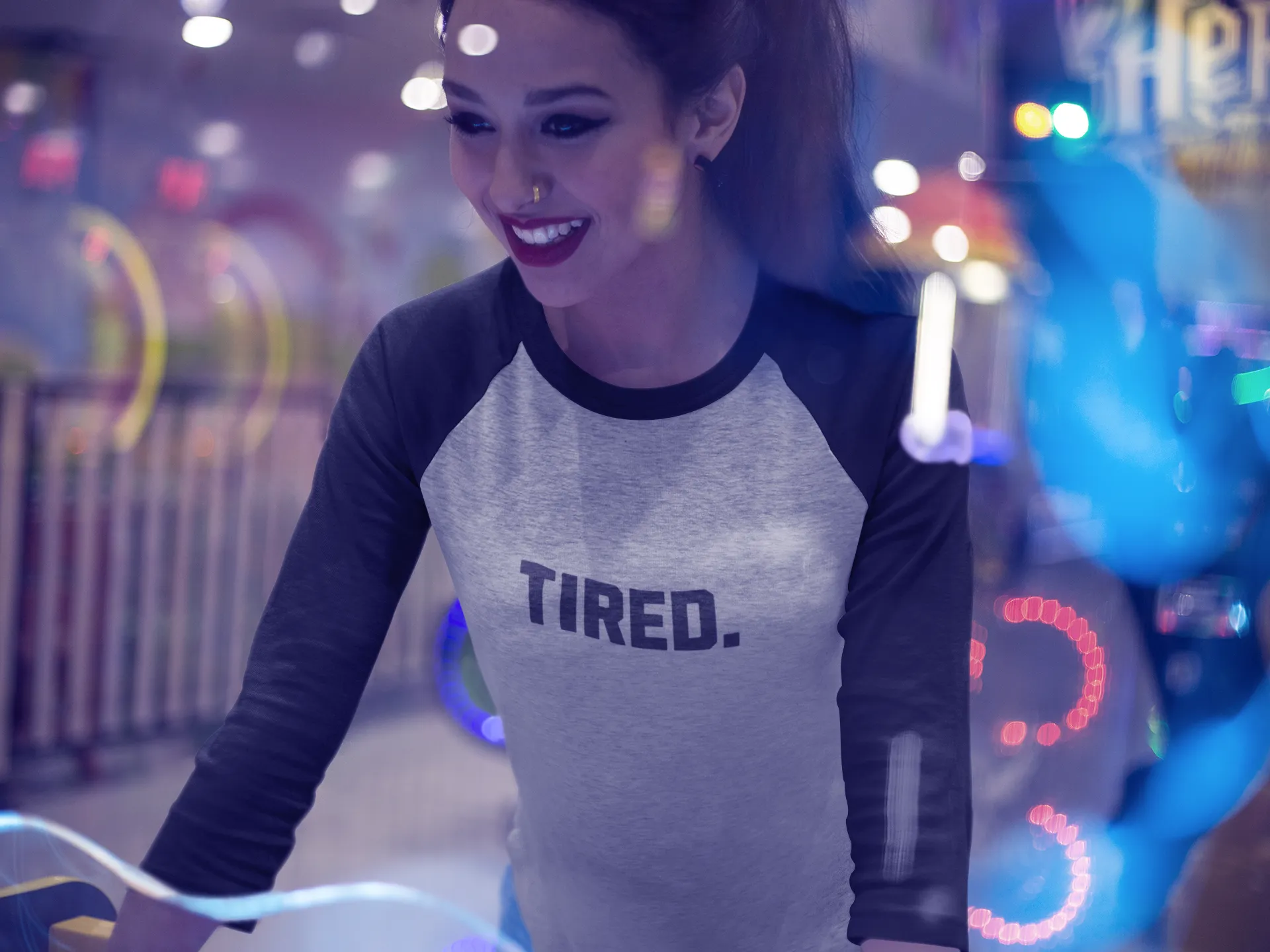 Woman wearing a 'TIRED.' shirt holding a drink in a casual setting