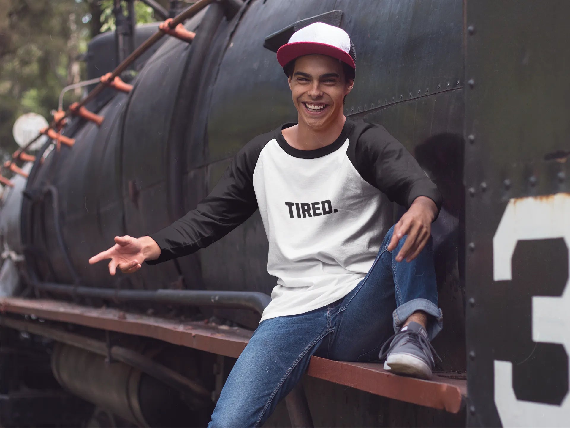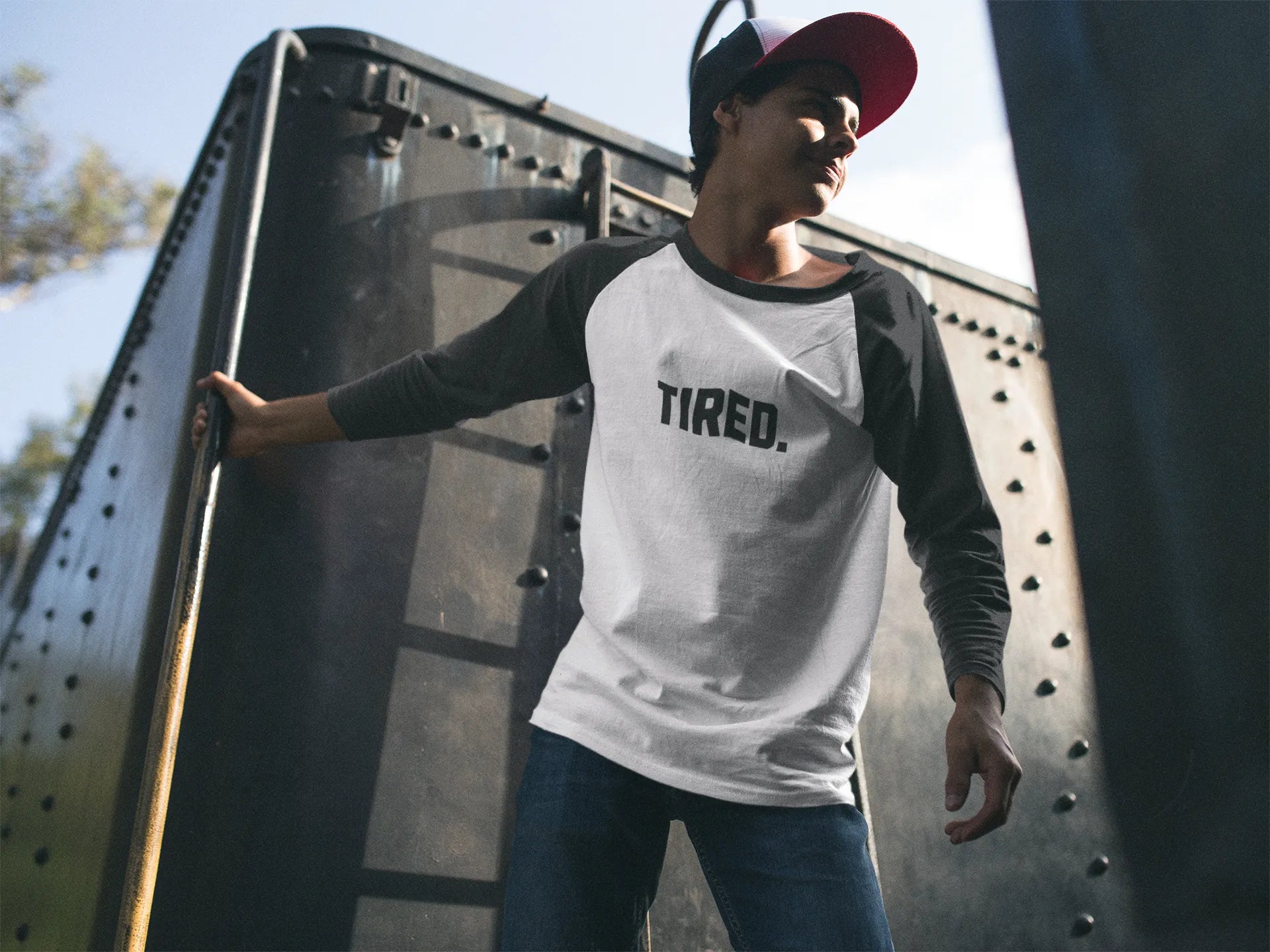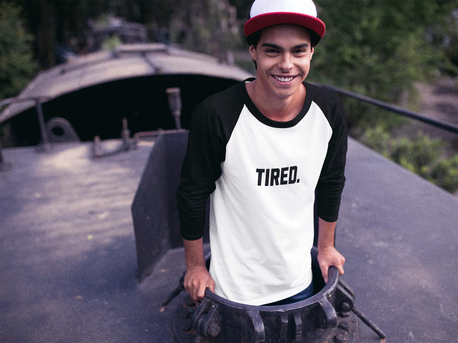 Person wearing a white and black baseball shirt with 'TIRED.' text in an indoor setting.