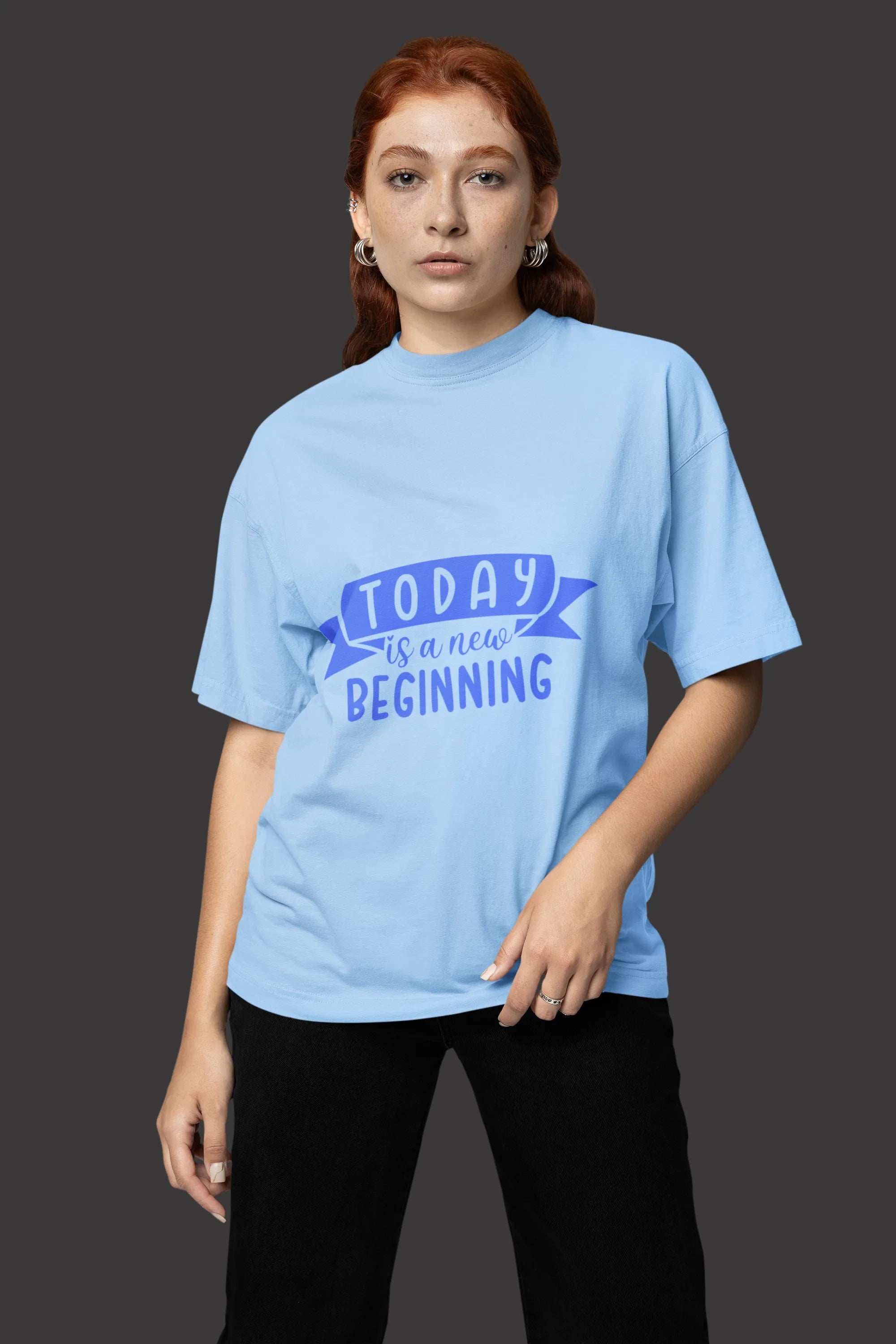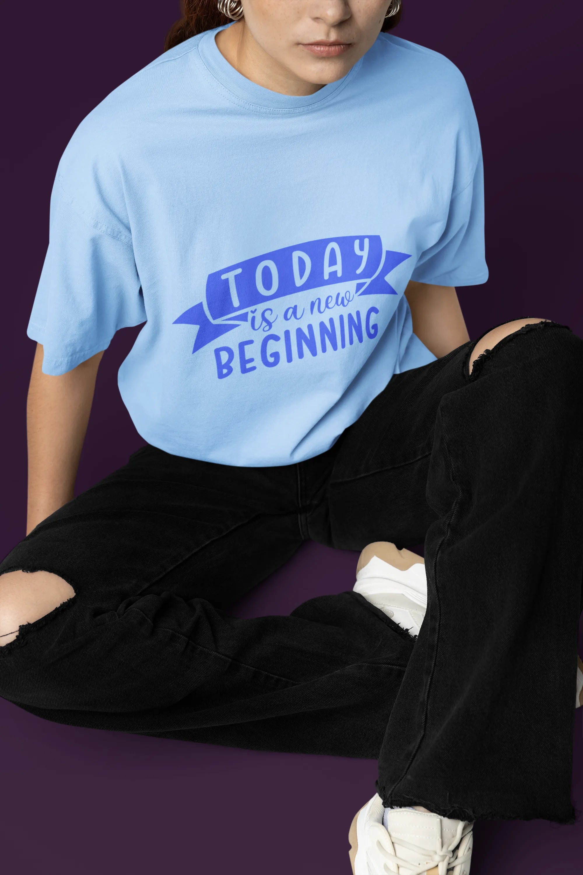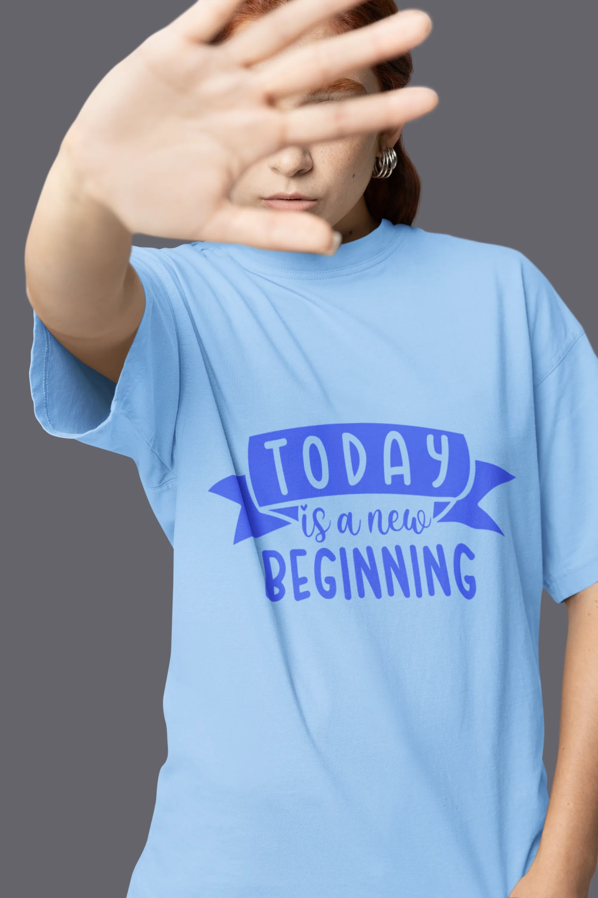 A minimalist t-shirt design featuring the uplifting phrase "Today is a new beginning" in elegant typography. Soft pastel tones or sunrise hues evoke hope and renewal, making it perfect for those embracing fresh starts and positive vibes each day.