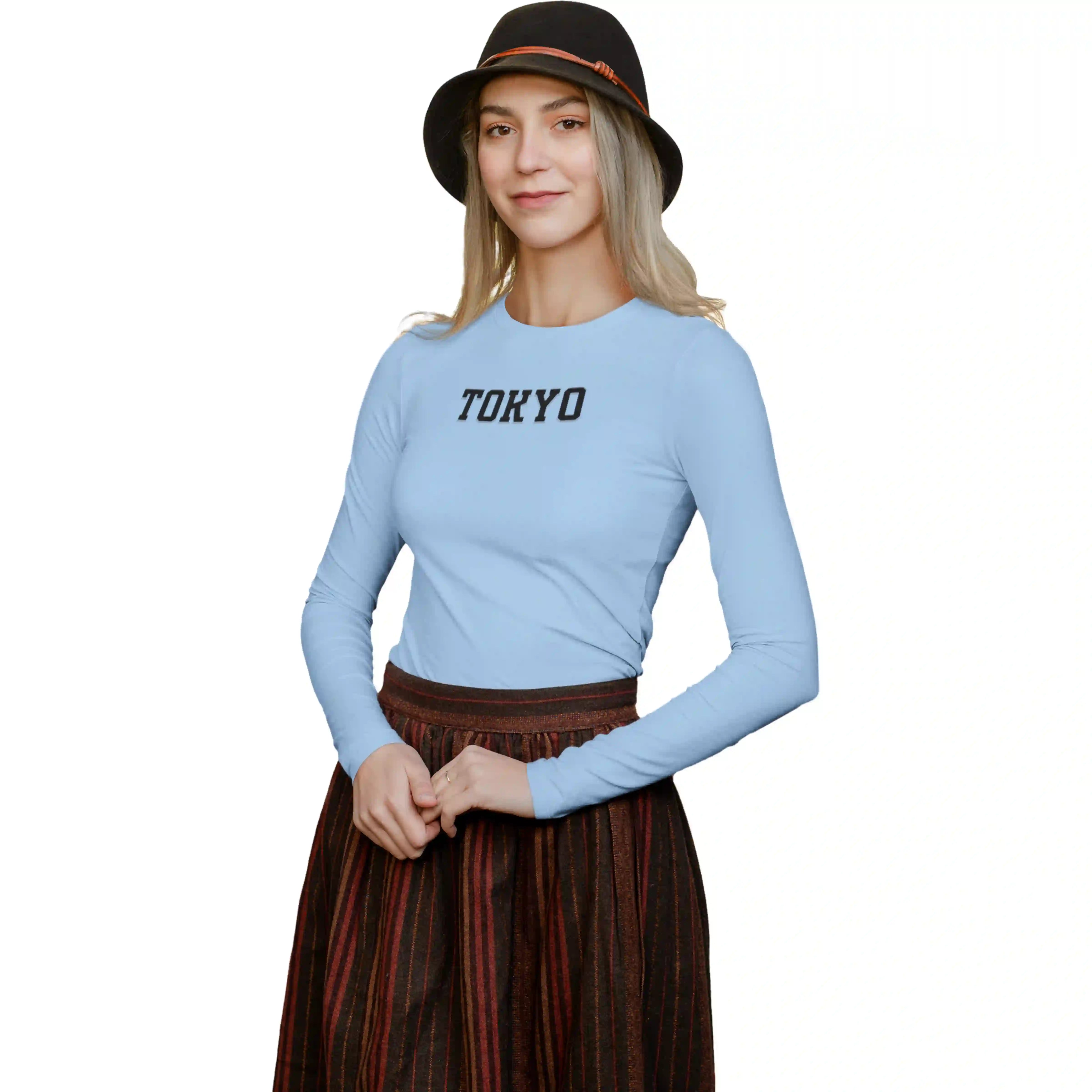 Chic and minimal — the 'Tokyo' baby blue T-shirt reflects cool city vibes and effortless everyday elegance.