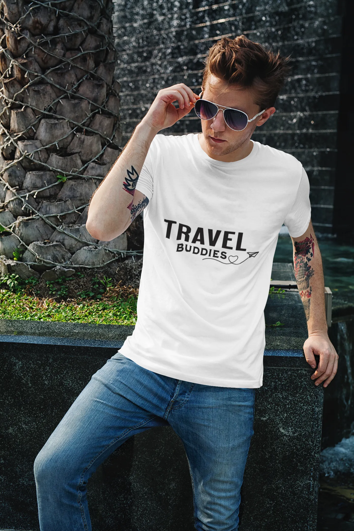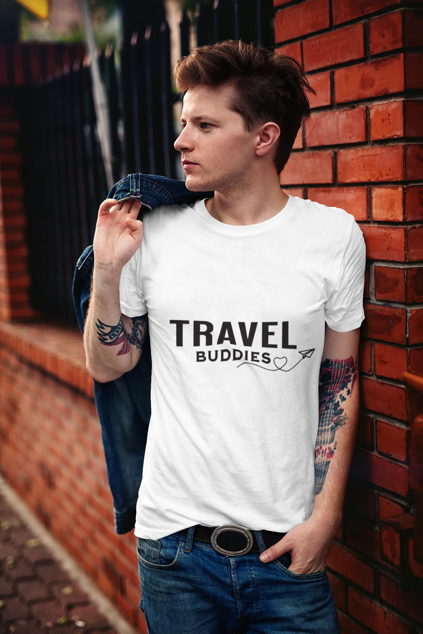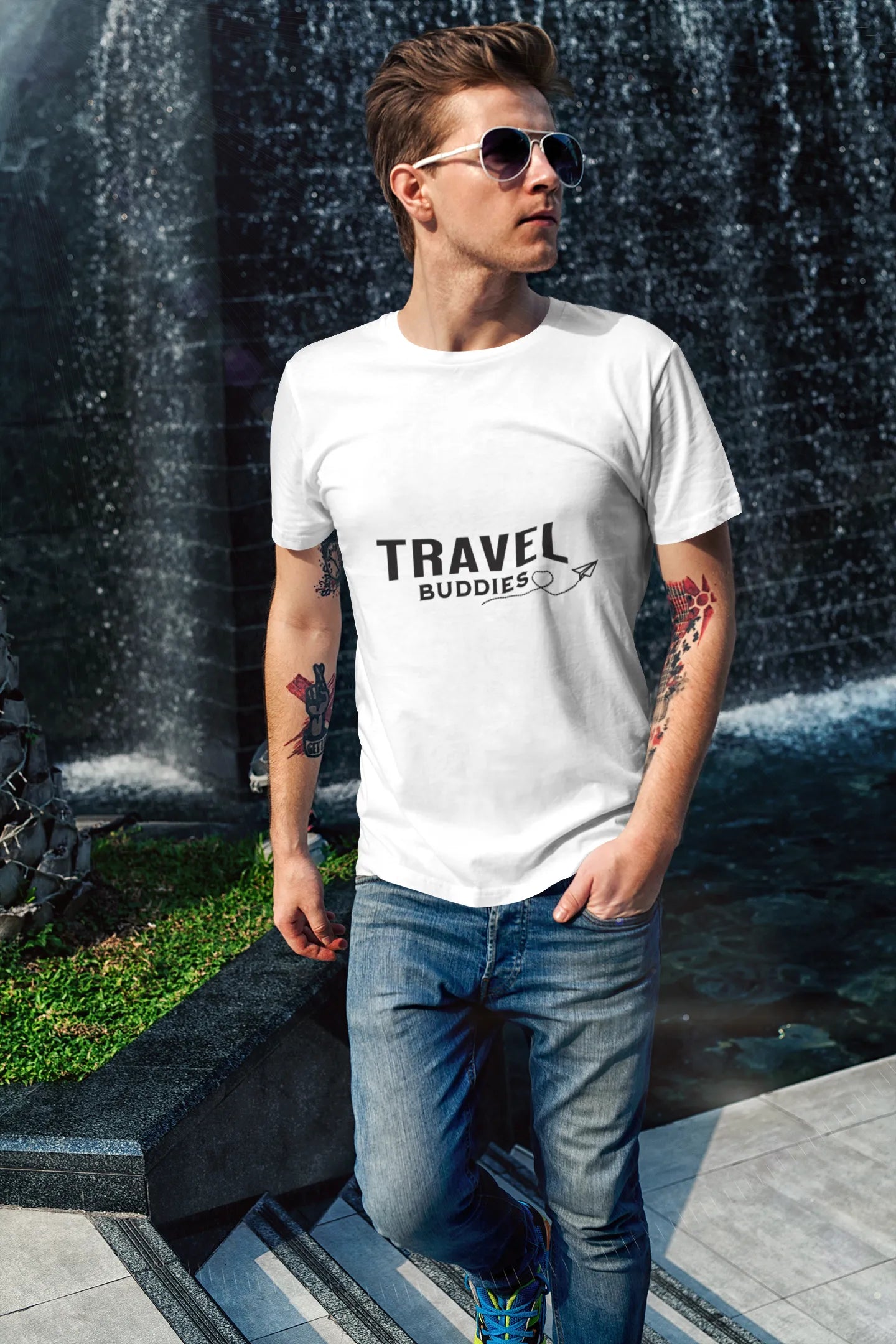 Person wearing a white t-shirt with 'TRAVEL BUDDIES' text, standing outdoors.