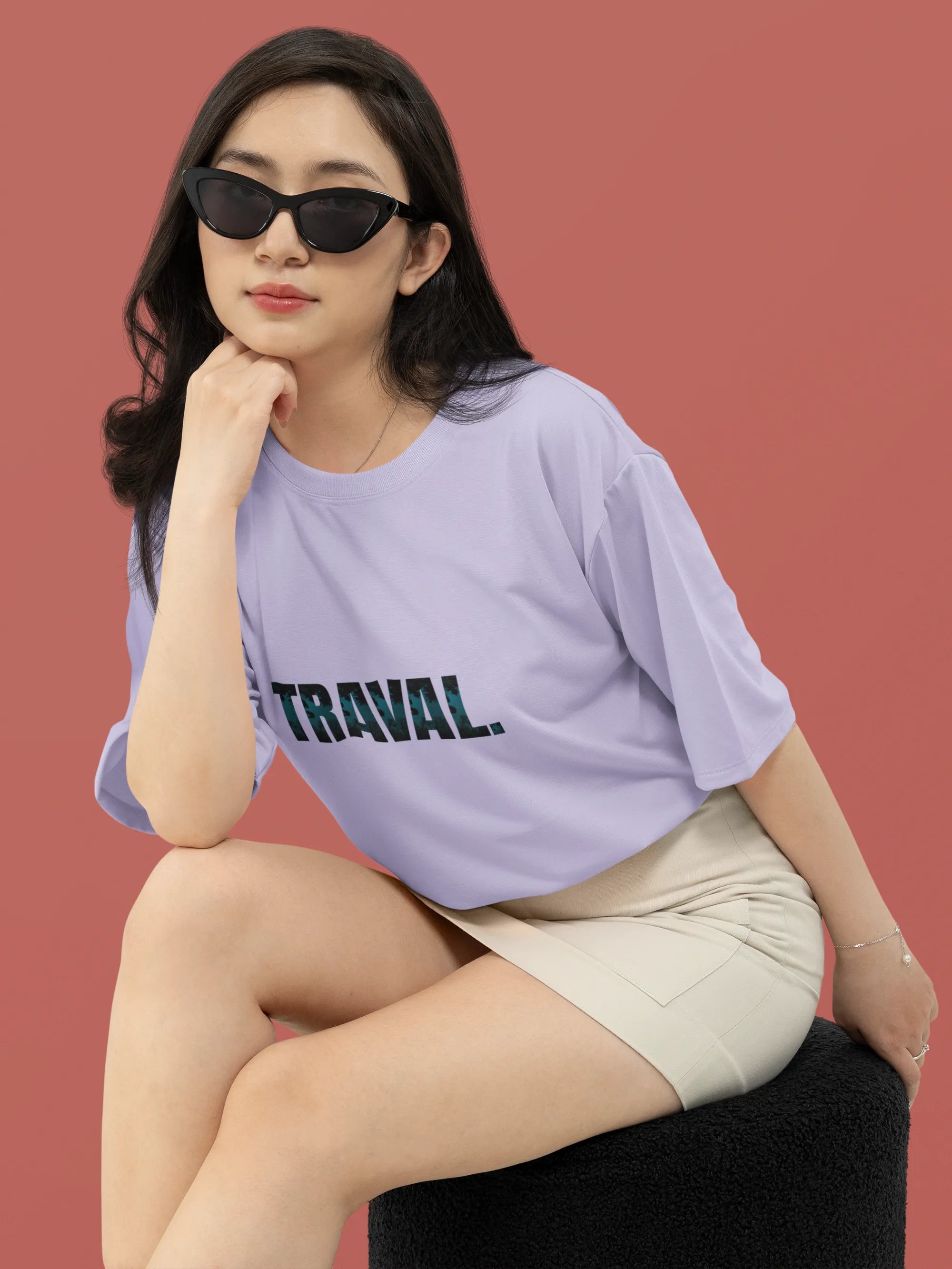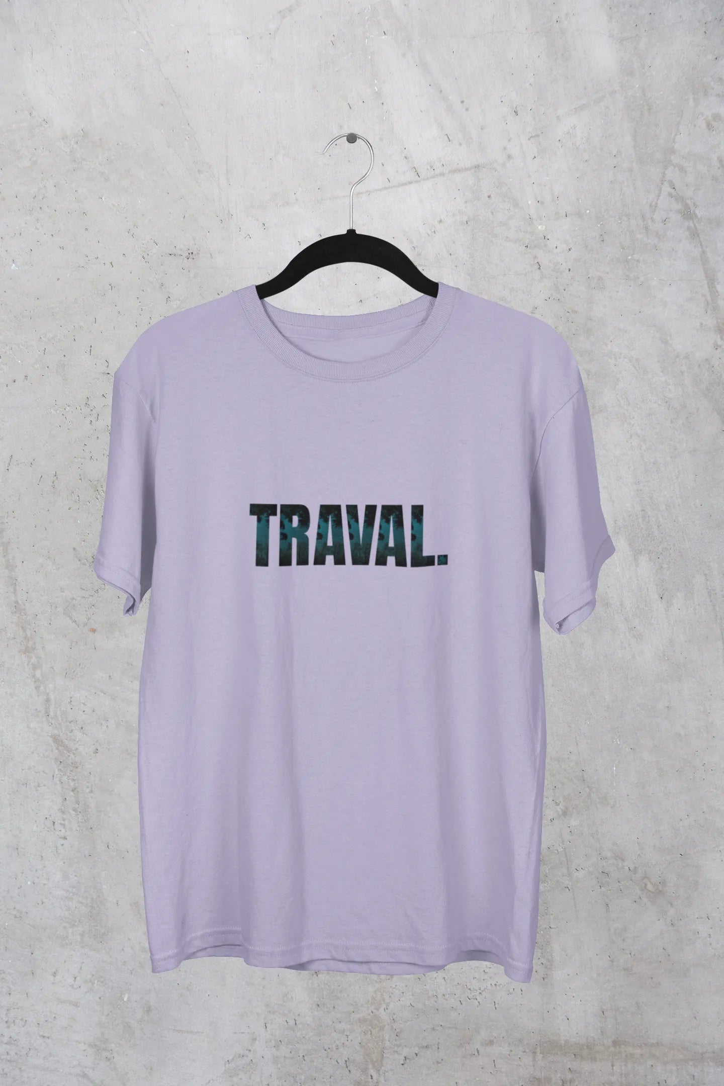 Woman wearing a 'TRAVAL' t-shirt holding a coffee cup outdoors.