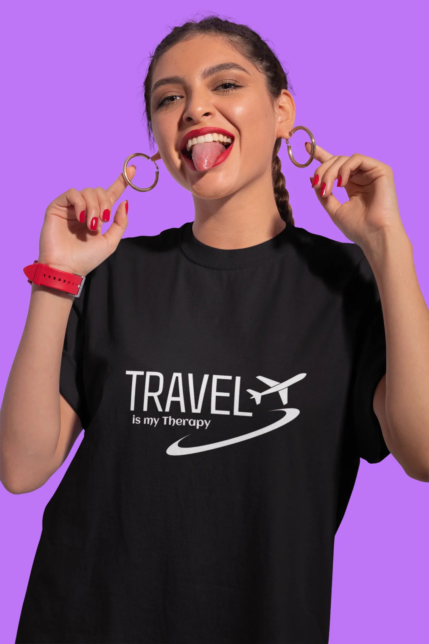 A stylish T-shirt design featuring a minimalist yet vibrant travel-themed graphic—airplane, suitcase, and scenic elements like mountains or beaches. The phrase "Travel is My Therapy" is elegantly scripted, emphasizing adventure and relaxation. Perfect for wanderlust souls and travel lovers!