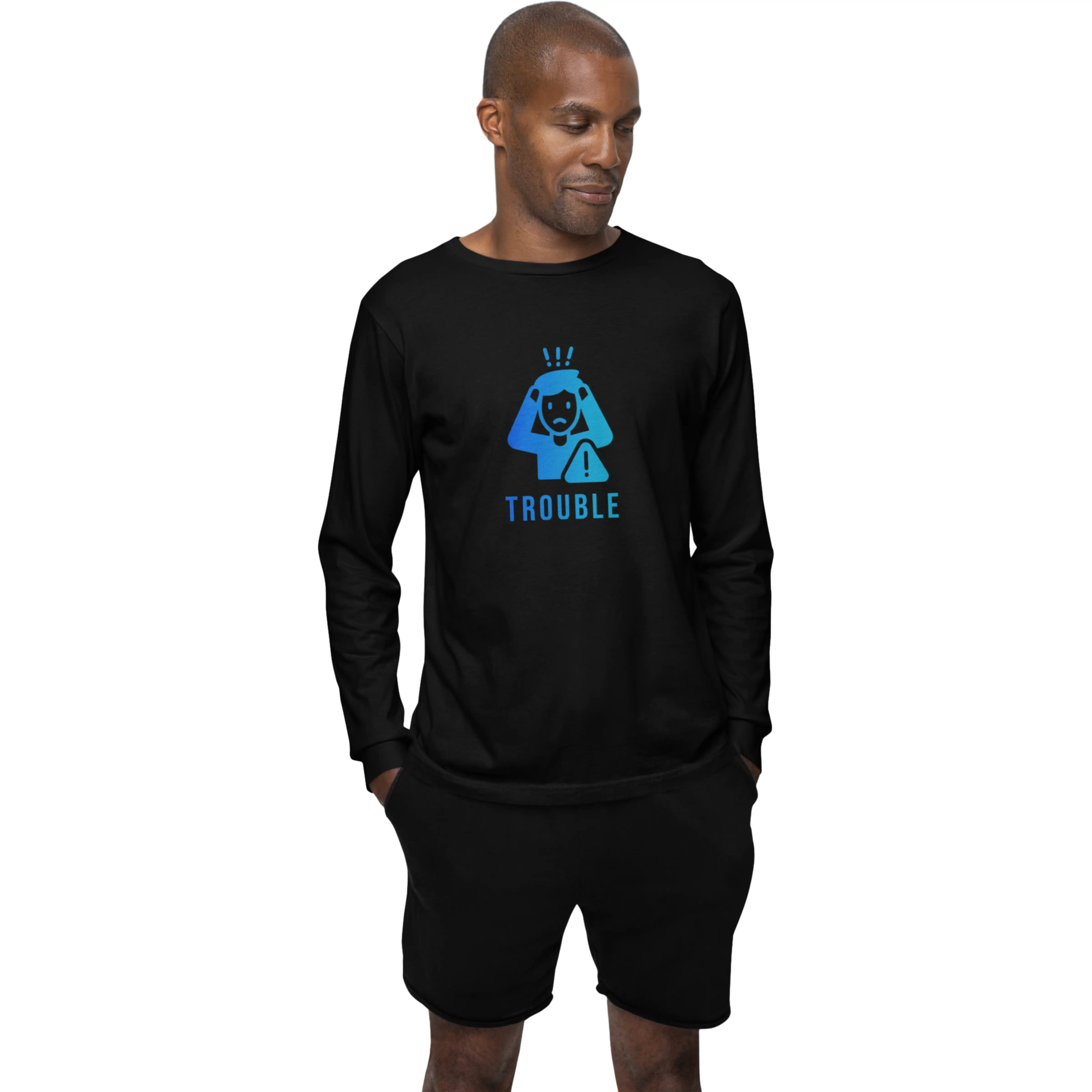 Make a bold impression in this black full-sleeve T-shirt with a “Trouble” statement print. Designed for a regular fit with a round neck, it combines comfort and attitude — perfect for those who love playful rebellion.