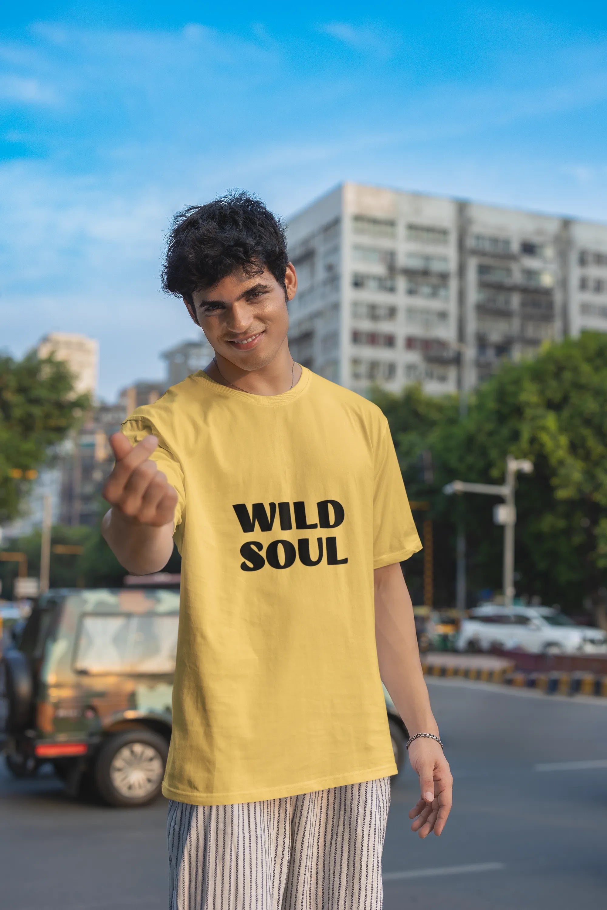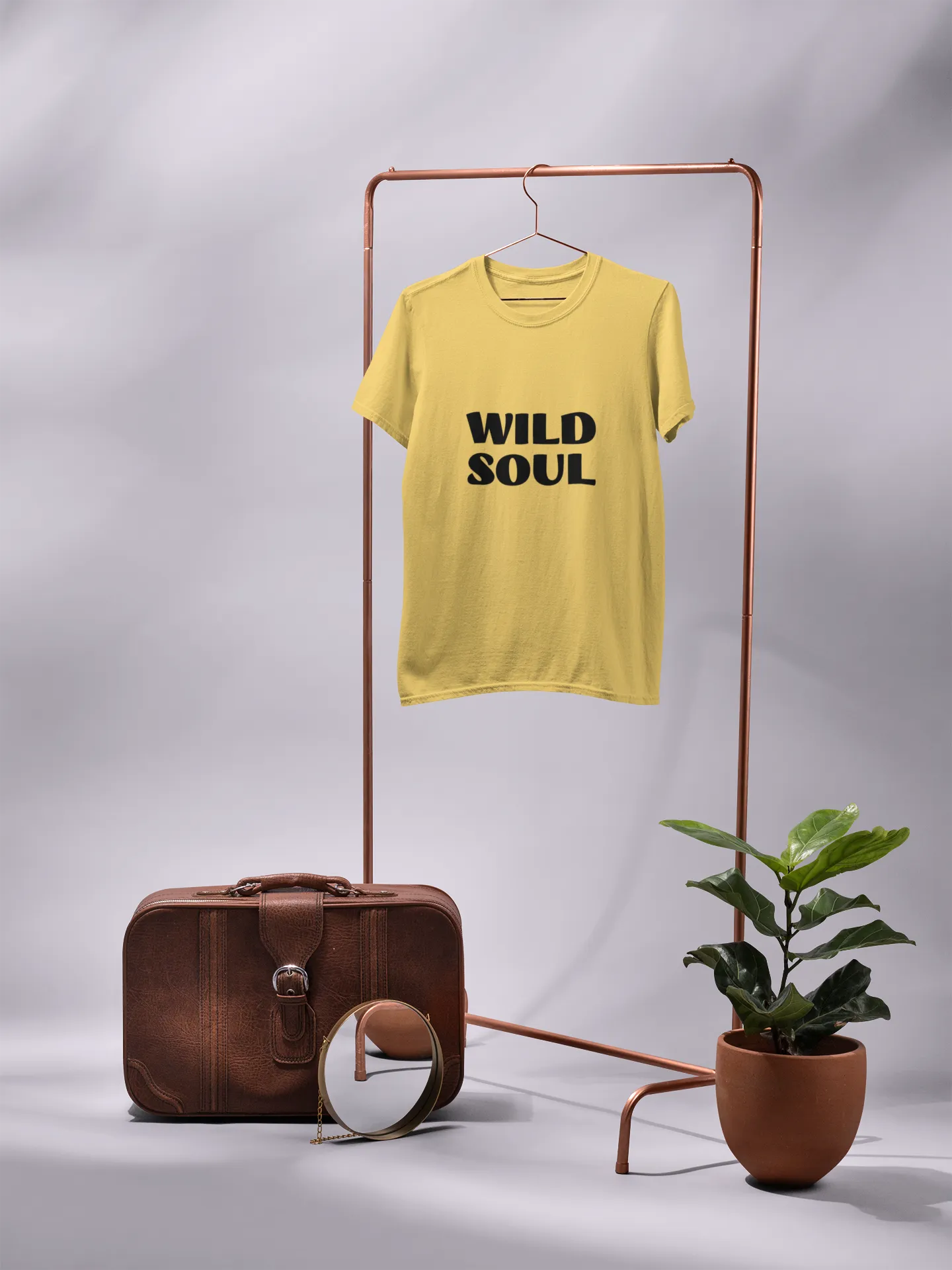 A bold T-shirt design featuring the phrase "WILD SOUL" in rugged, distressed typography. Accented with nature-inspired elements like mountains, trees, or animal silhouettes, it captures the spirit of freedom, adventure, and an untamed heart.
