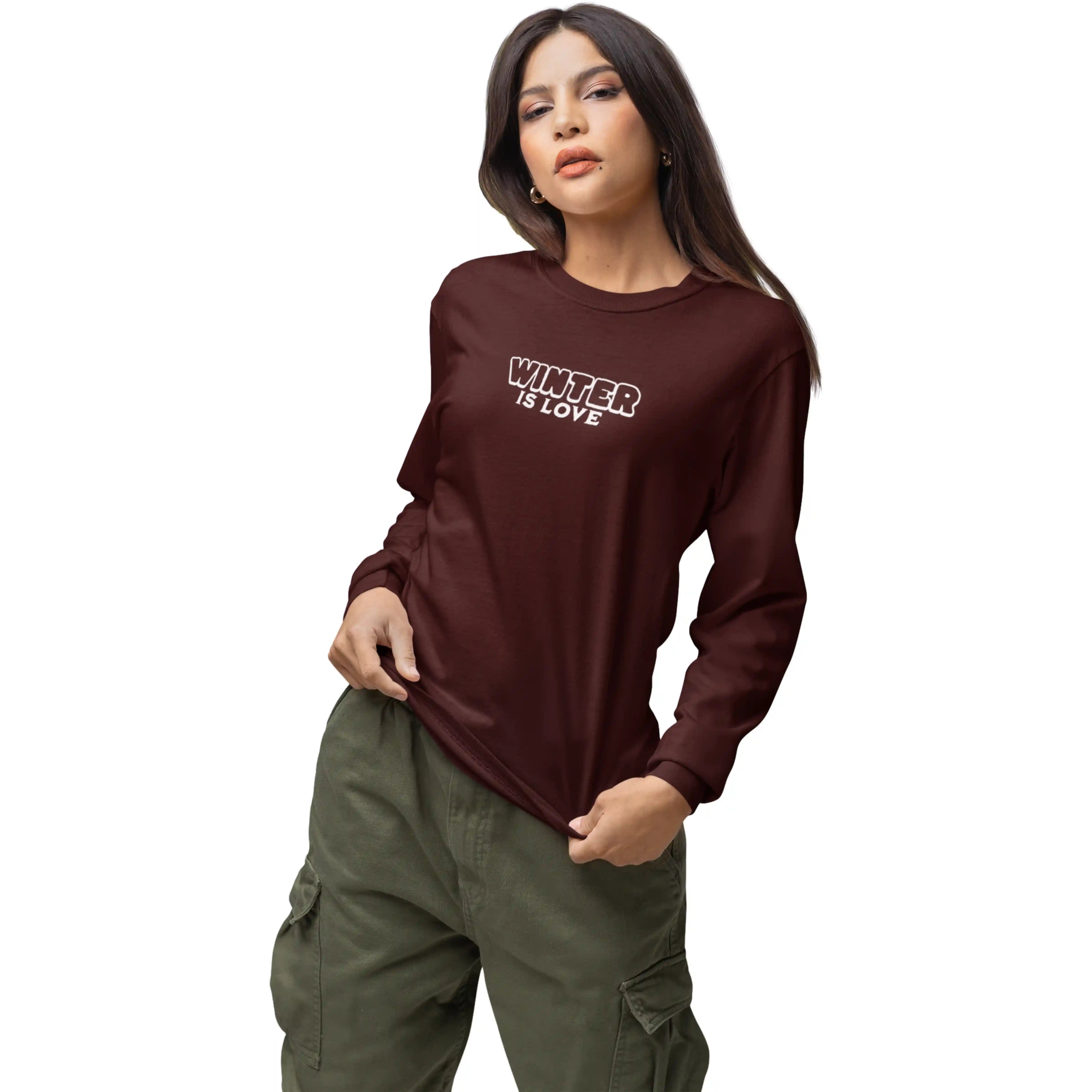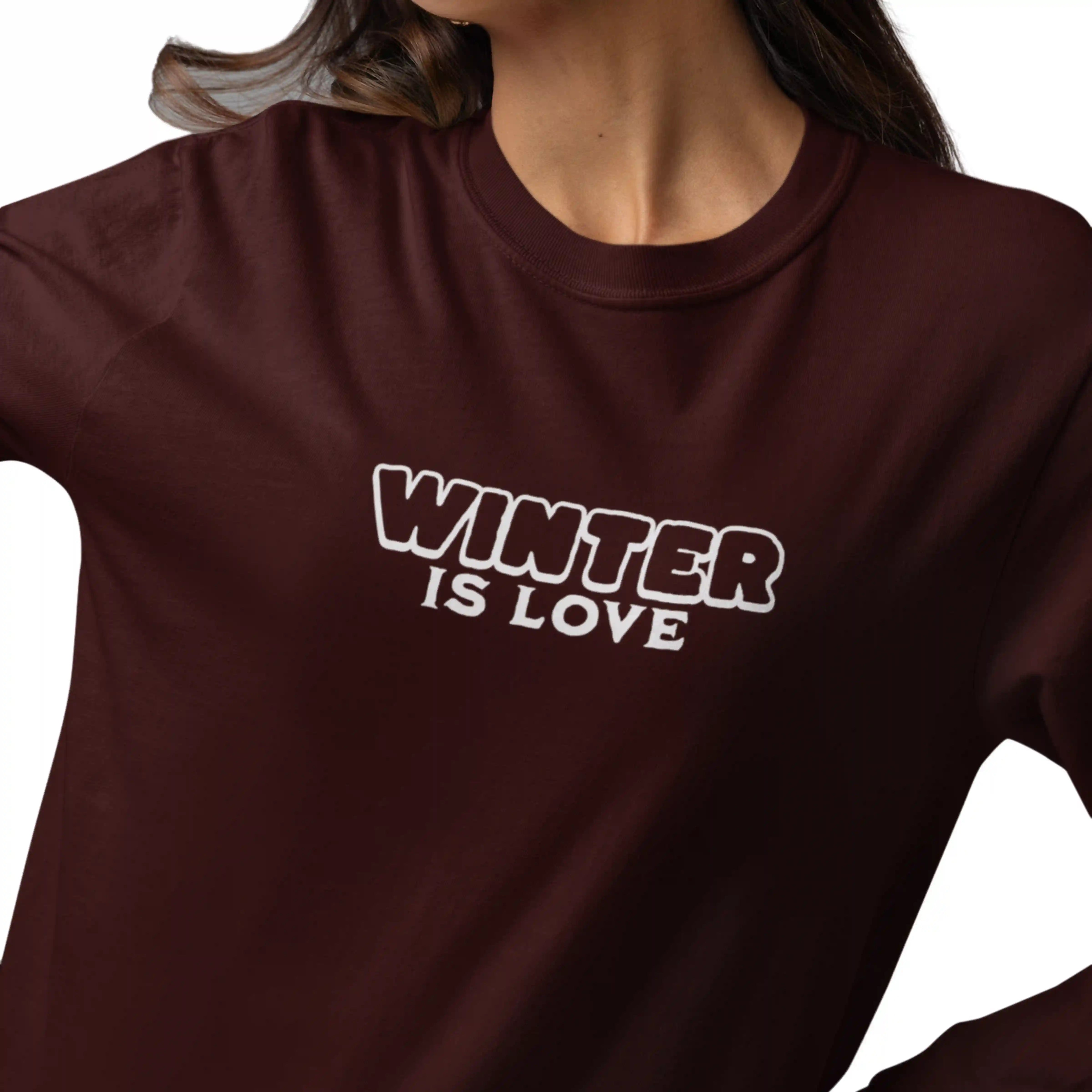 Cozy and cute — the 'Winter Is Love' maroon T-shirt wraps you in warmth and festive charm all season long.
