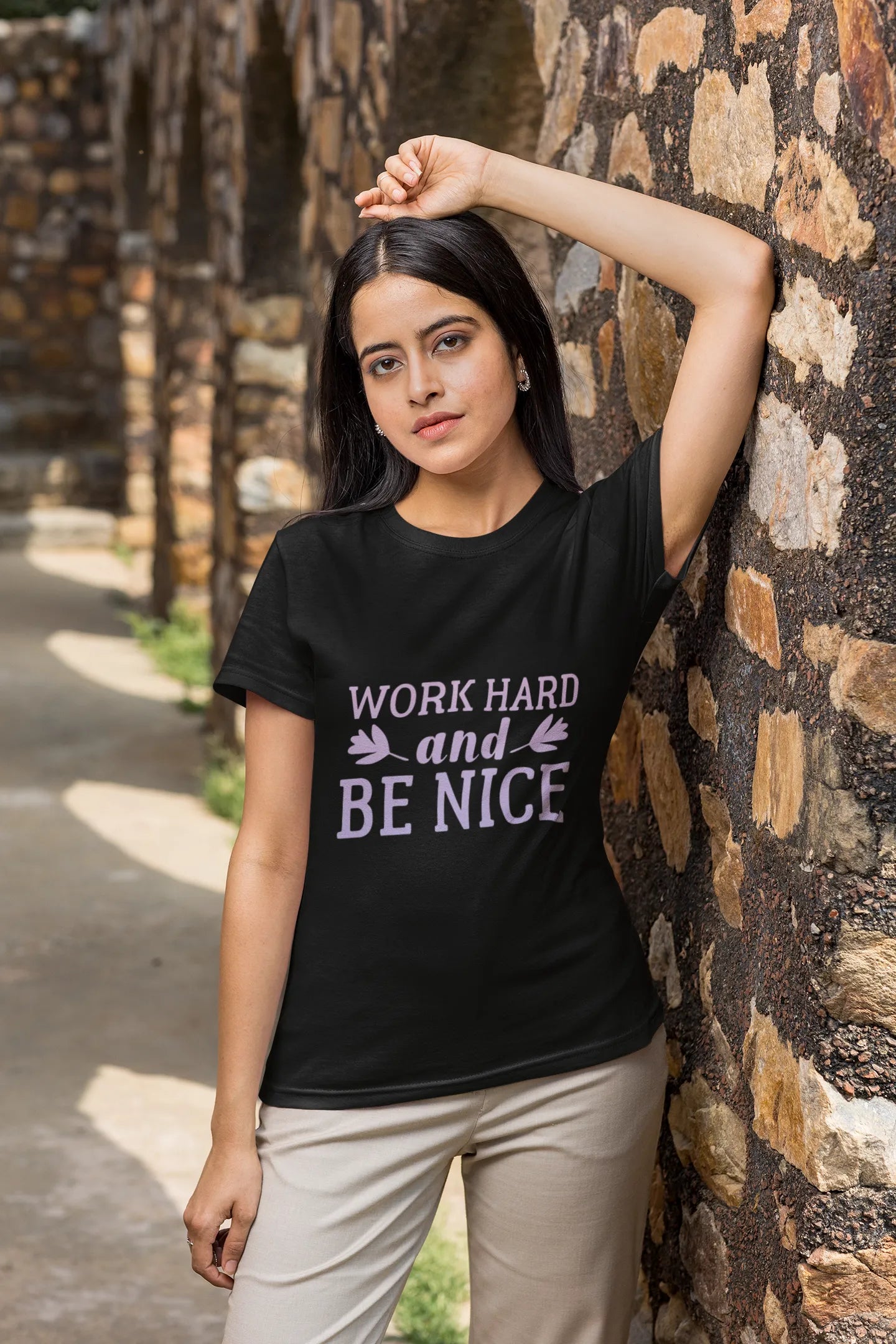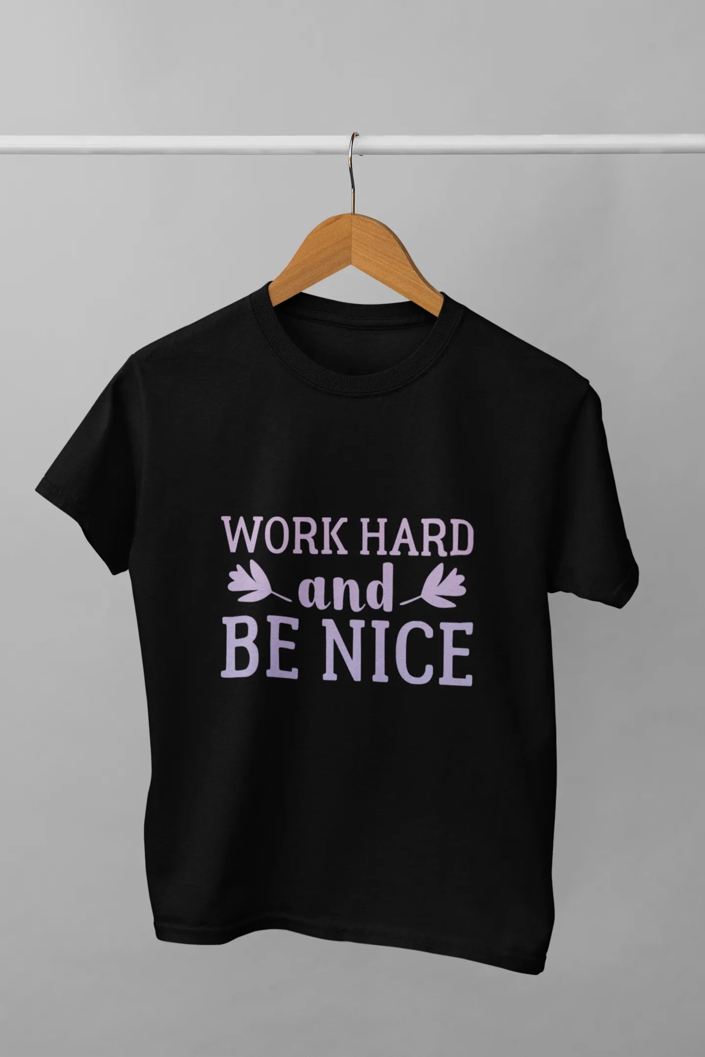 A stylish T-shirt design featuring the uplifting quote "Work Hard and Be Nice" in a balanced, modern font. The words "Work Hard" are bold and strong, while "Be Nice" is in a softer, handwritten style, creating a motivating yet friendly vibe.