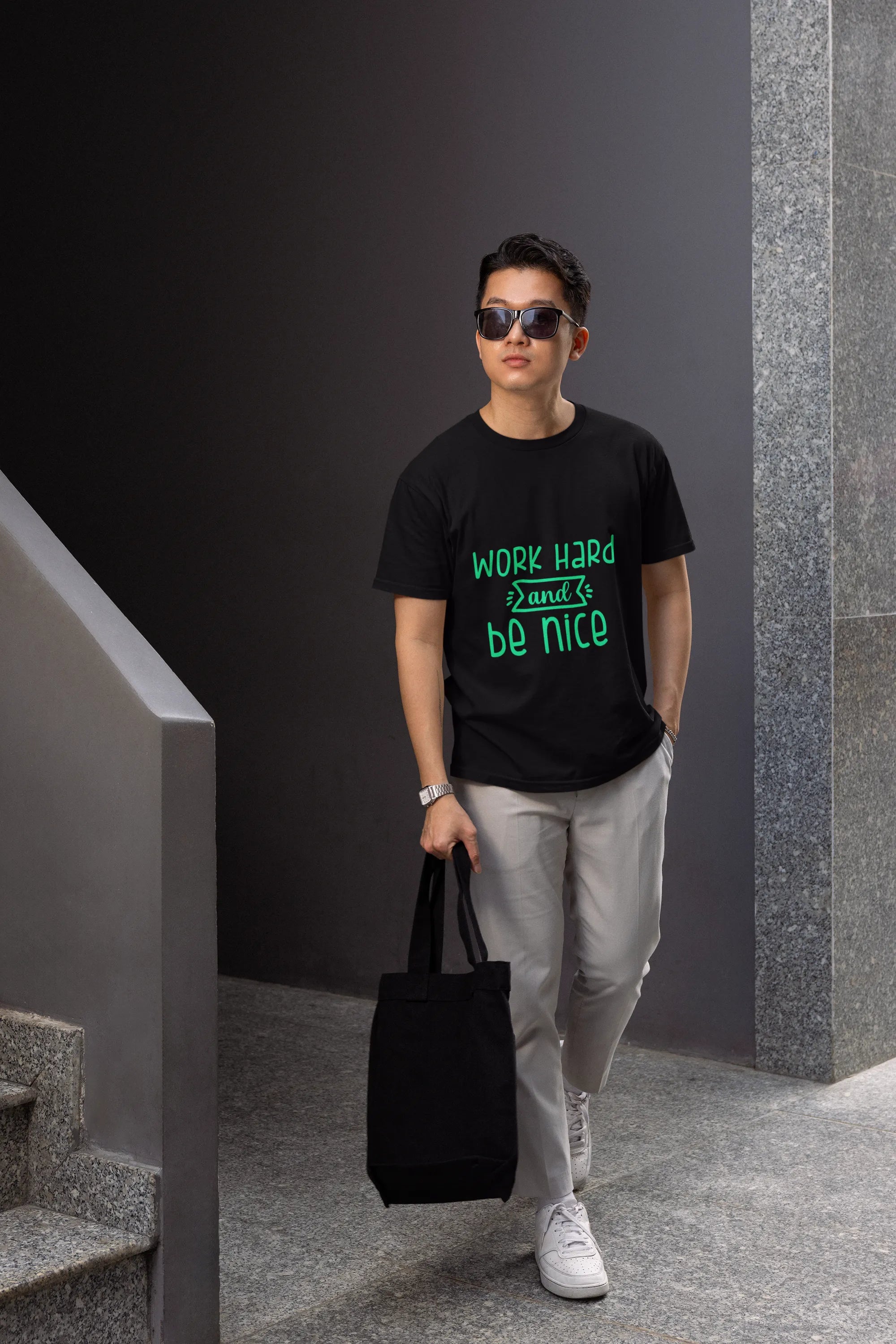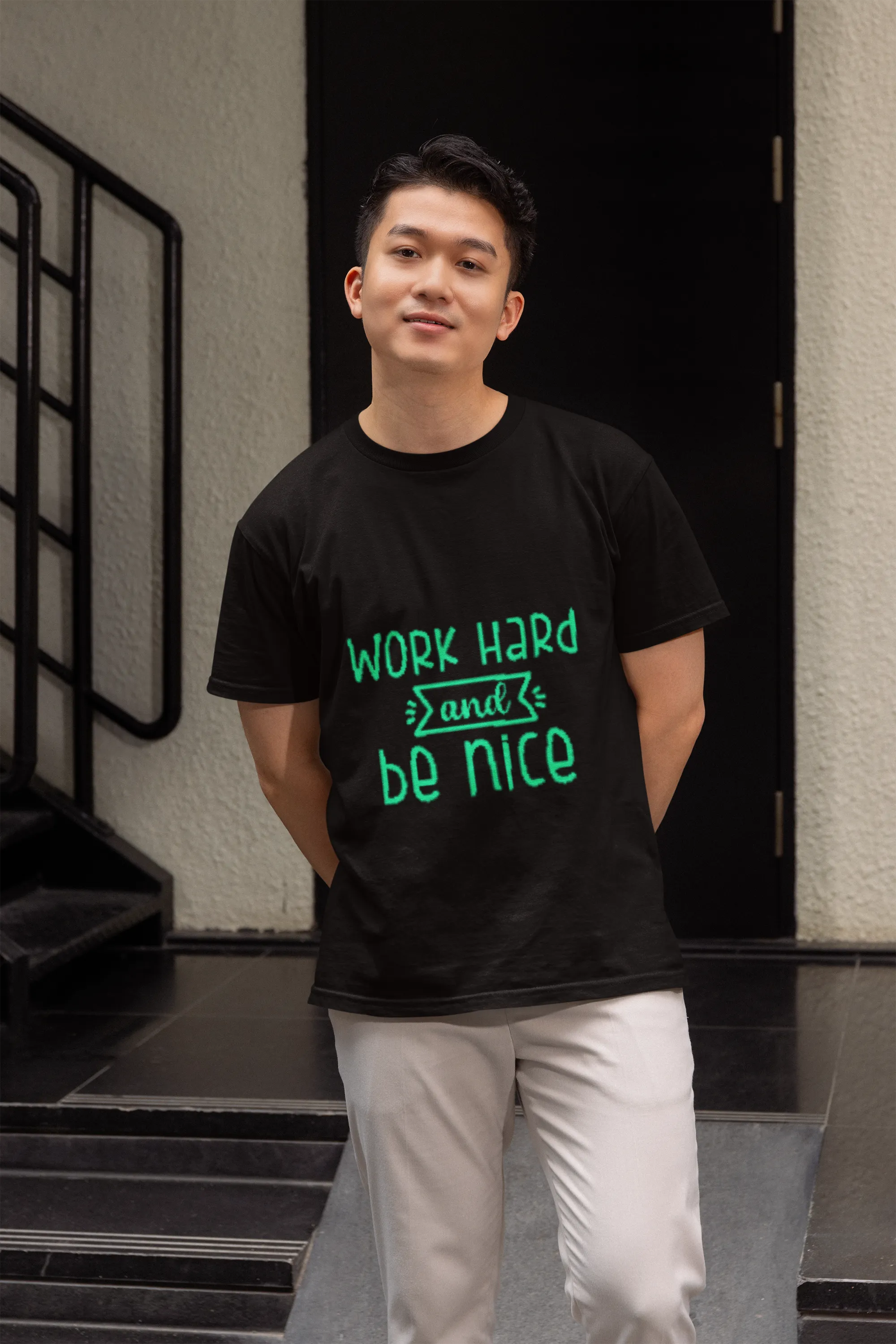 A minimal yet powerful T-shirt design featuring "Work Hard & Be Nice" in bold, modern typography. The text is arranged dynamically, with contrasting colors for emphasis. A clean, motivational aesthetic perfect for everyday wear, spreading positivity and determination effortlessly.