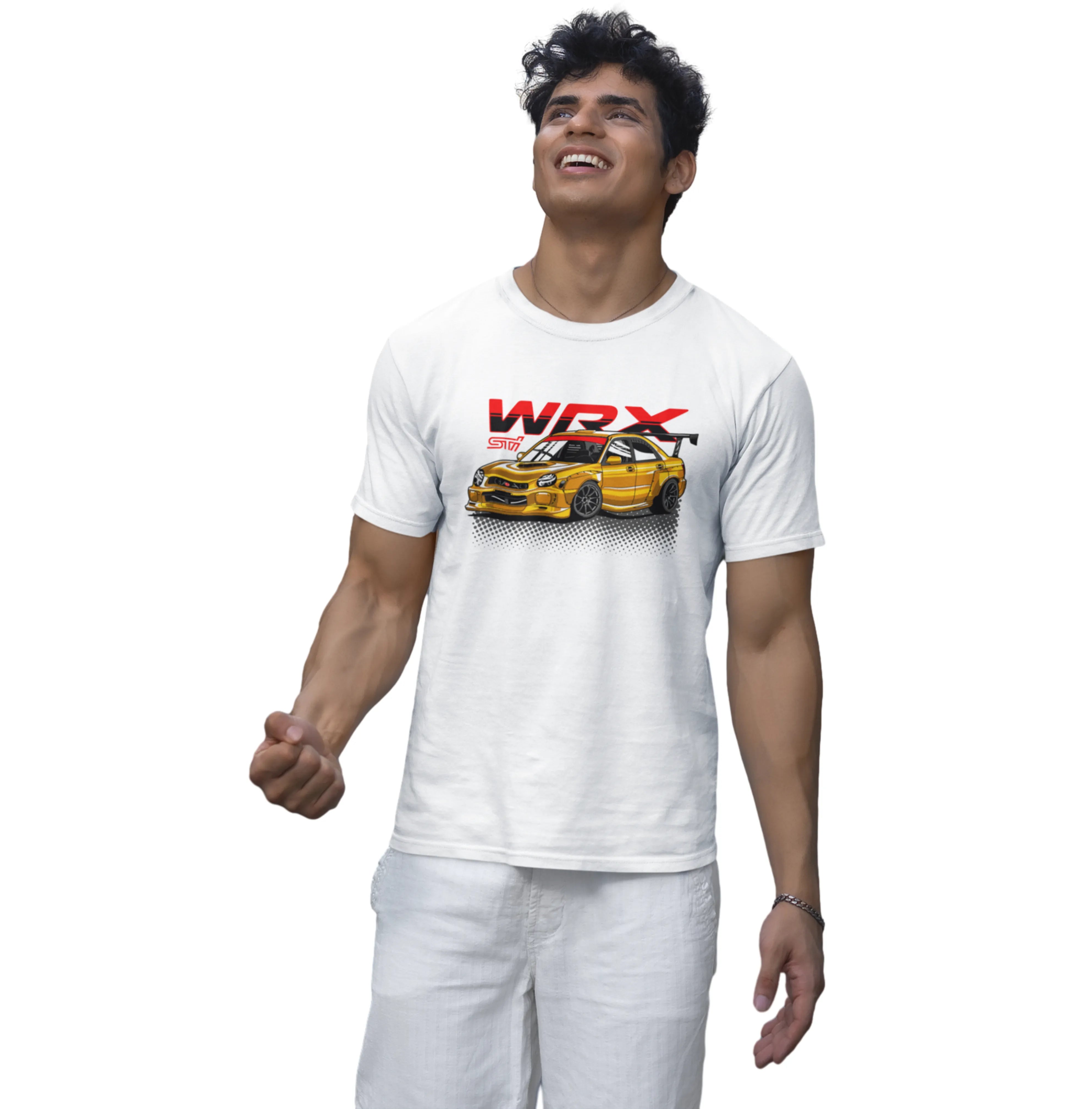 Person wearing a white t-shirt with a car graphic and 'WRX' text on a white background