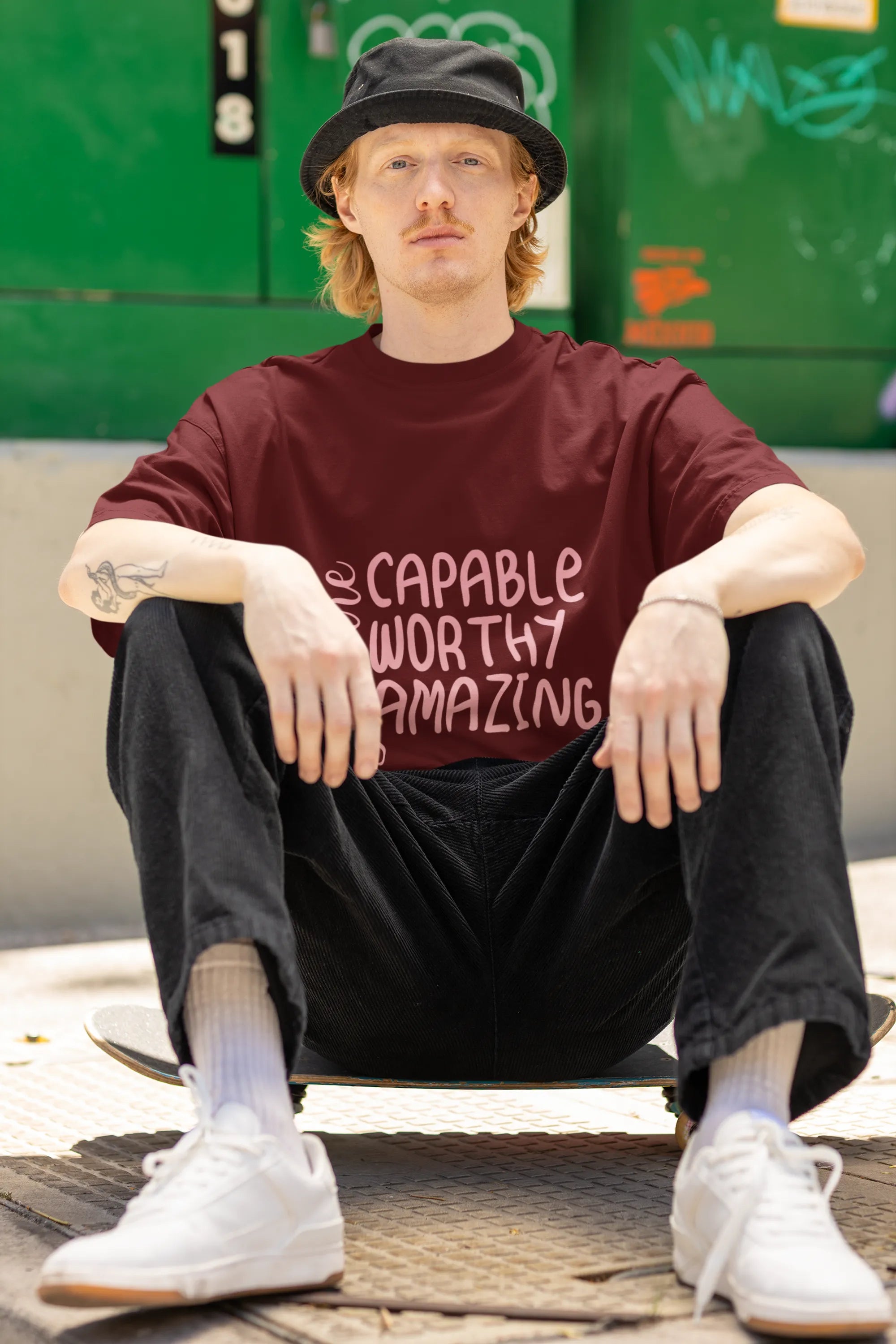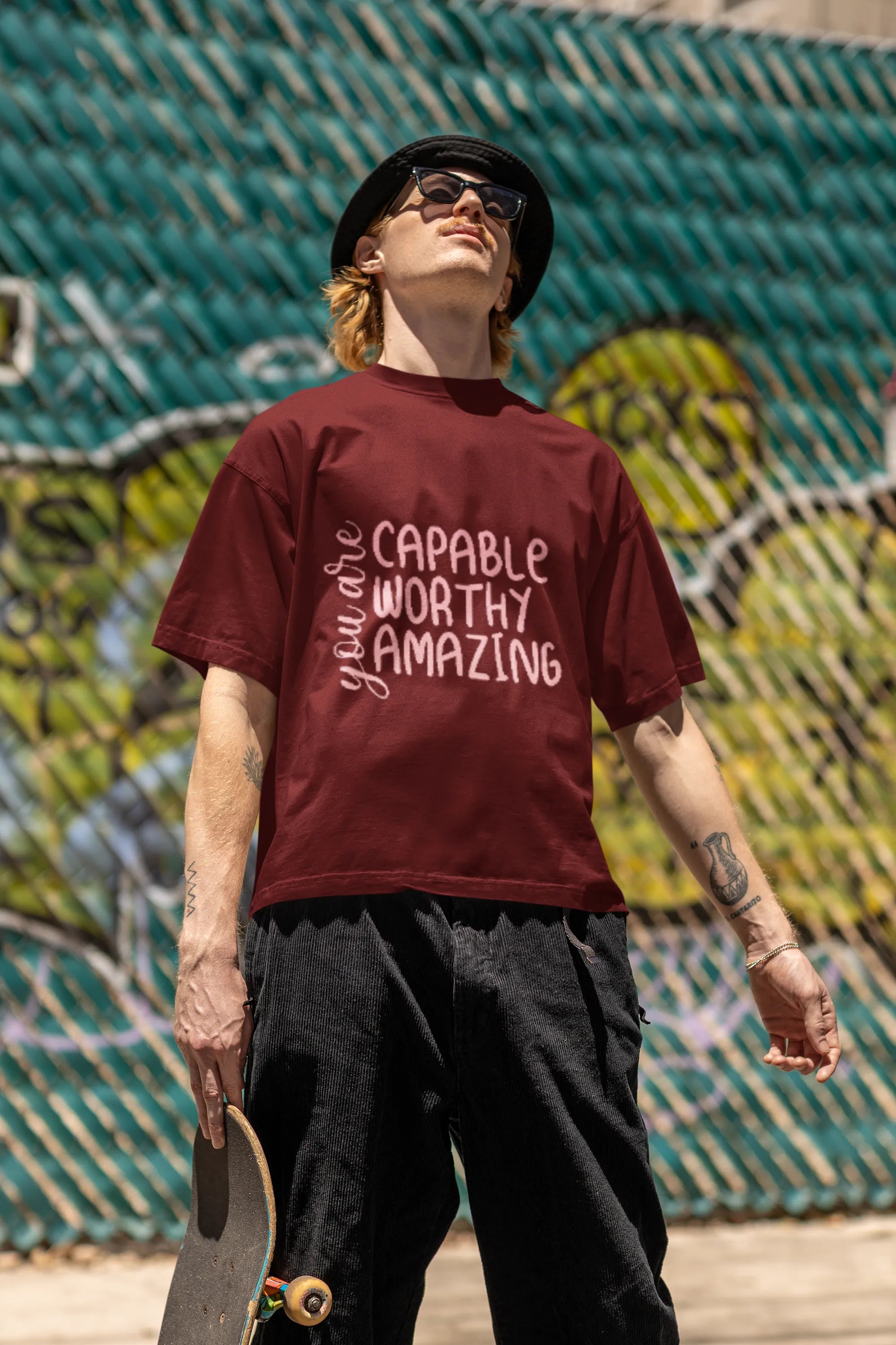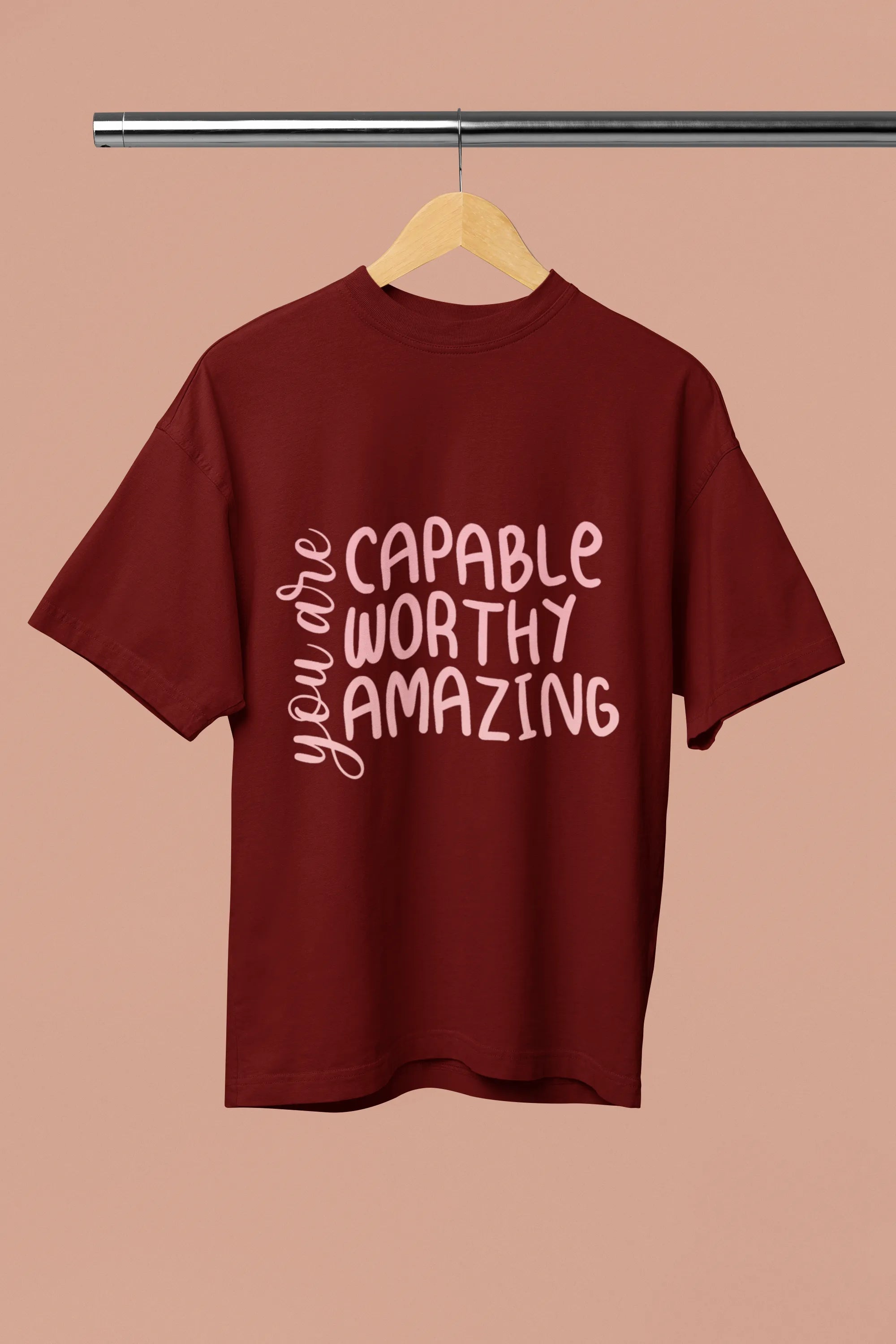 A stylish T-shirt design featuring the uplifting words "You are Capable, Worthy, Amazing" in bold, artistic typography. Accented with elegant swirls, soft pastel hues, or vibrant gradients, it radiates confidence and positivity—perfect for daily motivation and self-empowerment.
