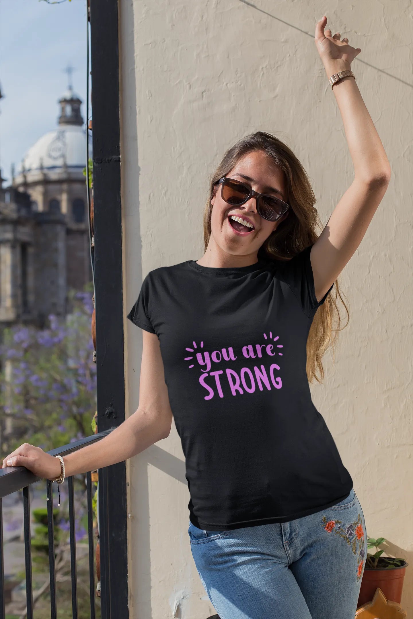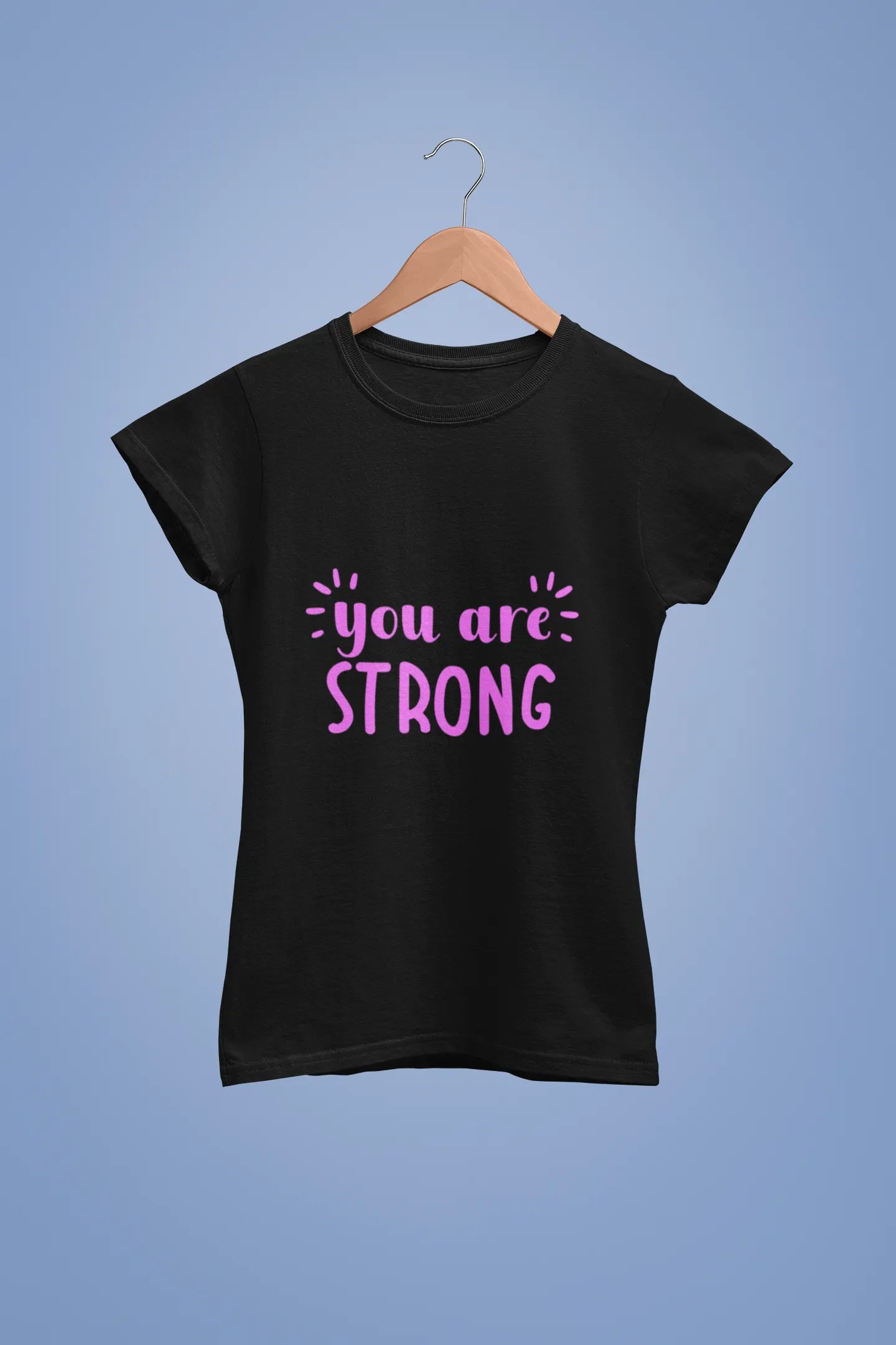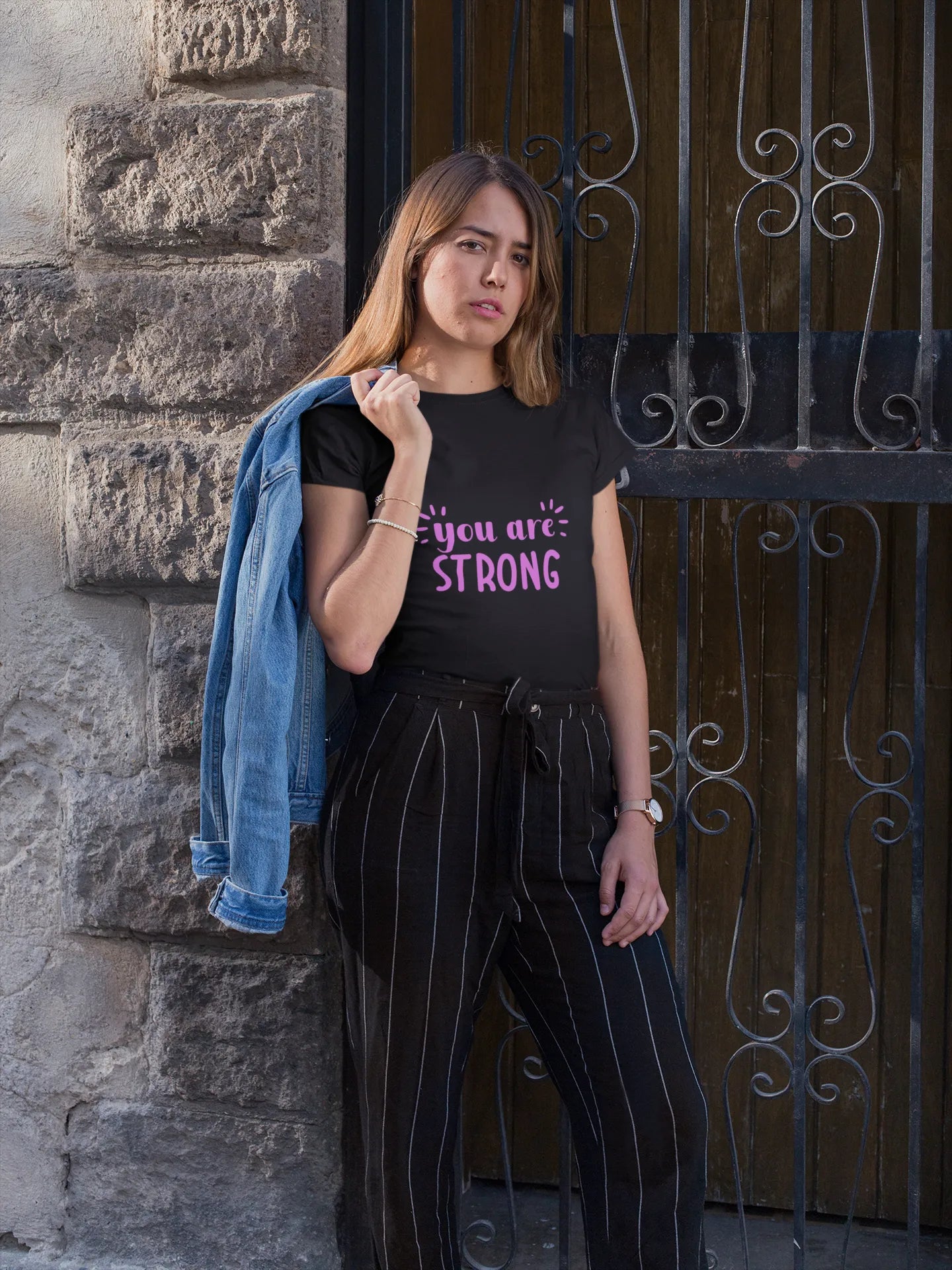 A bold "You Are Strong" design featuring powerful typography with a modern, sleek font. Accentuated by dynamic brush strokes or minimalistic lines, the design radiates confidence. Ideal for motivation, it blends empowering words with stylish aesthetics for an impactful look.