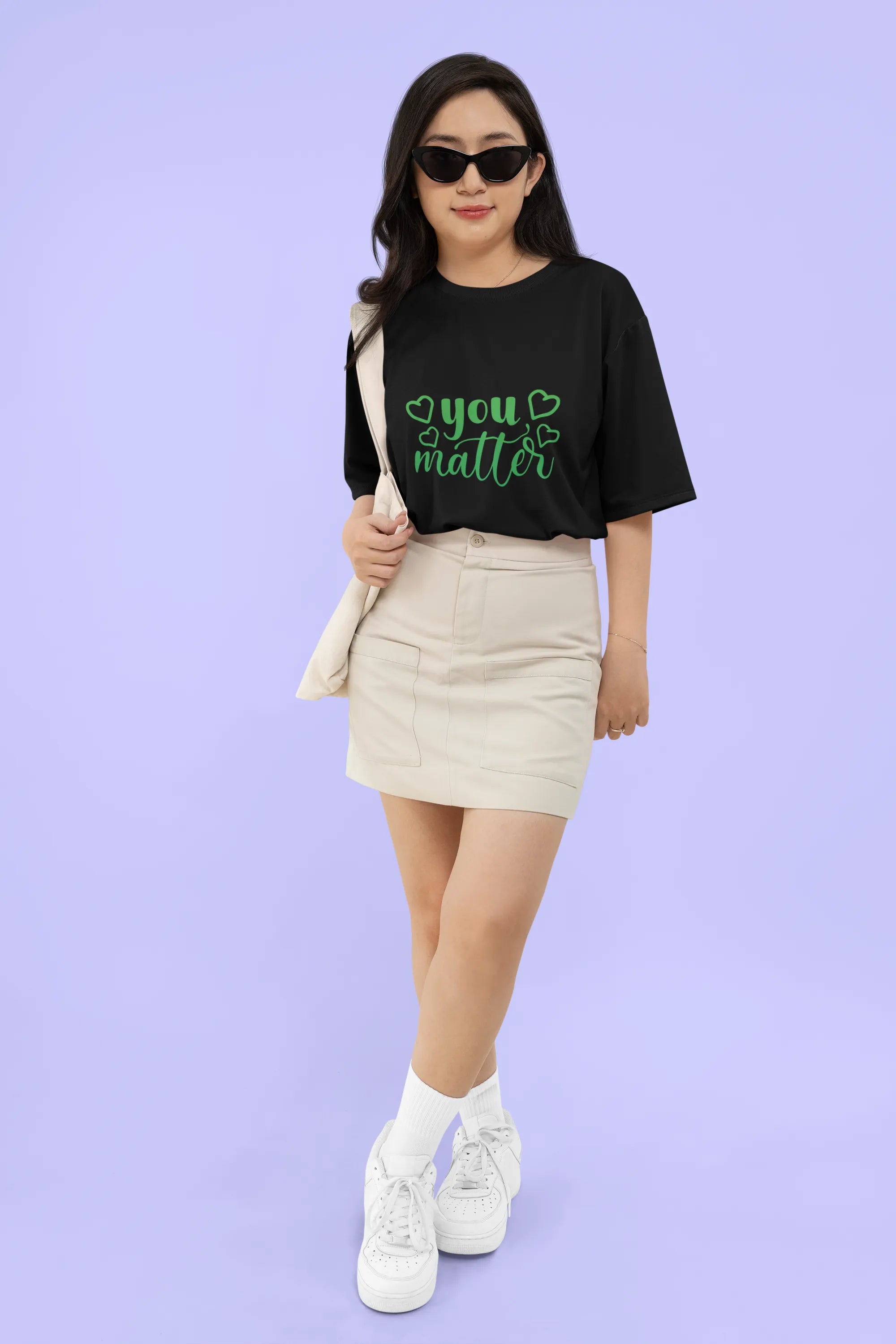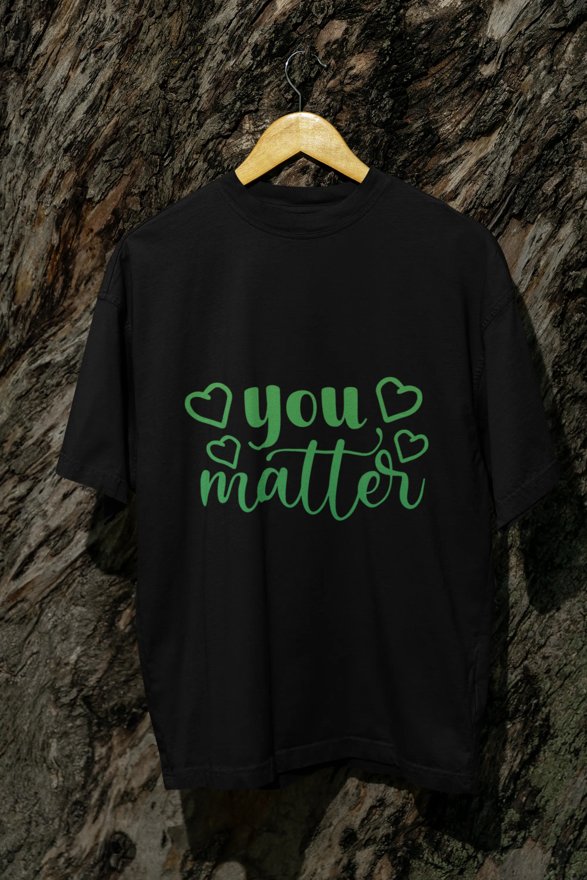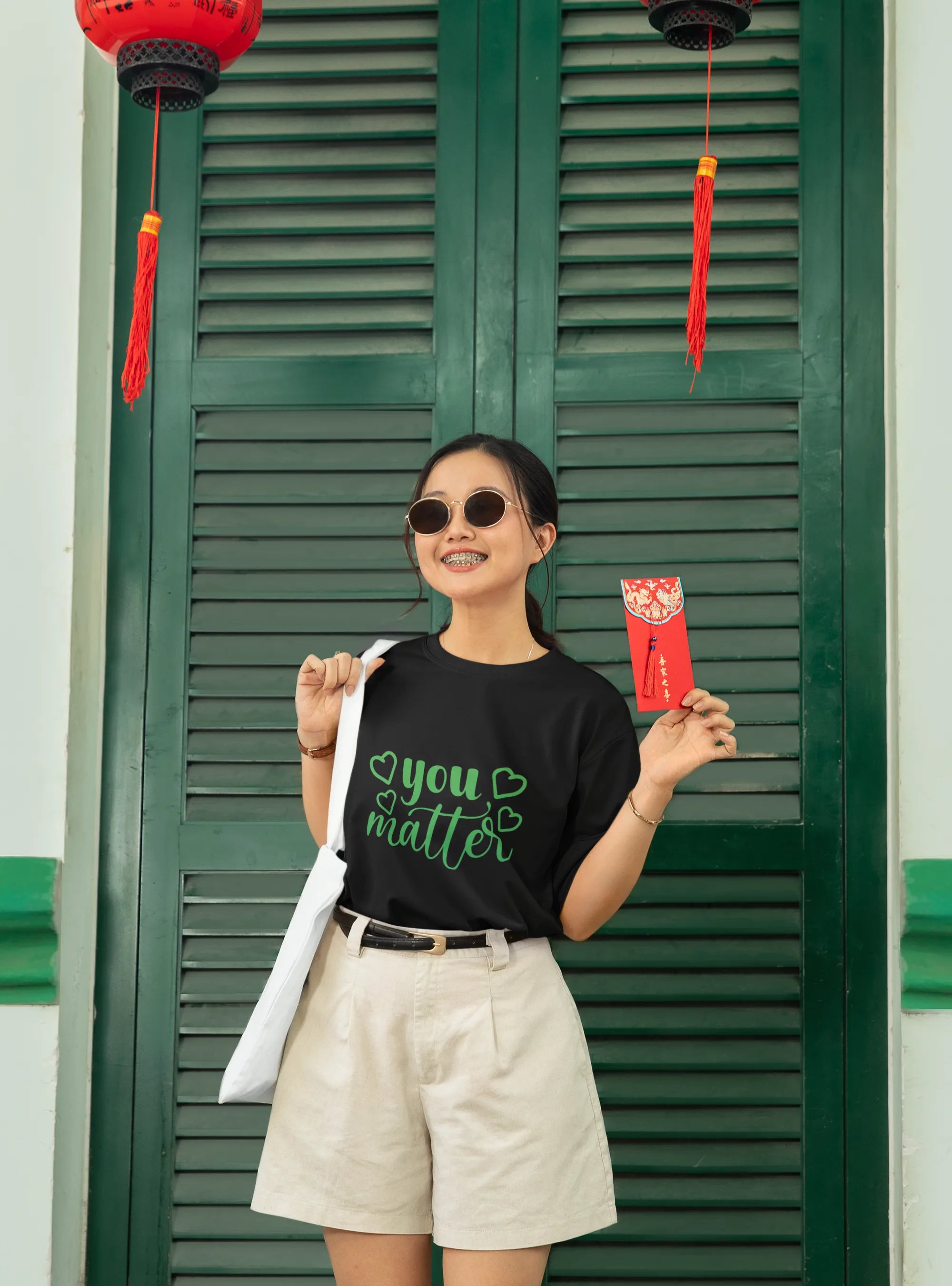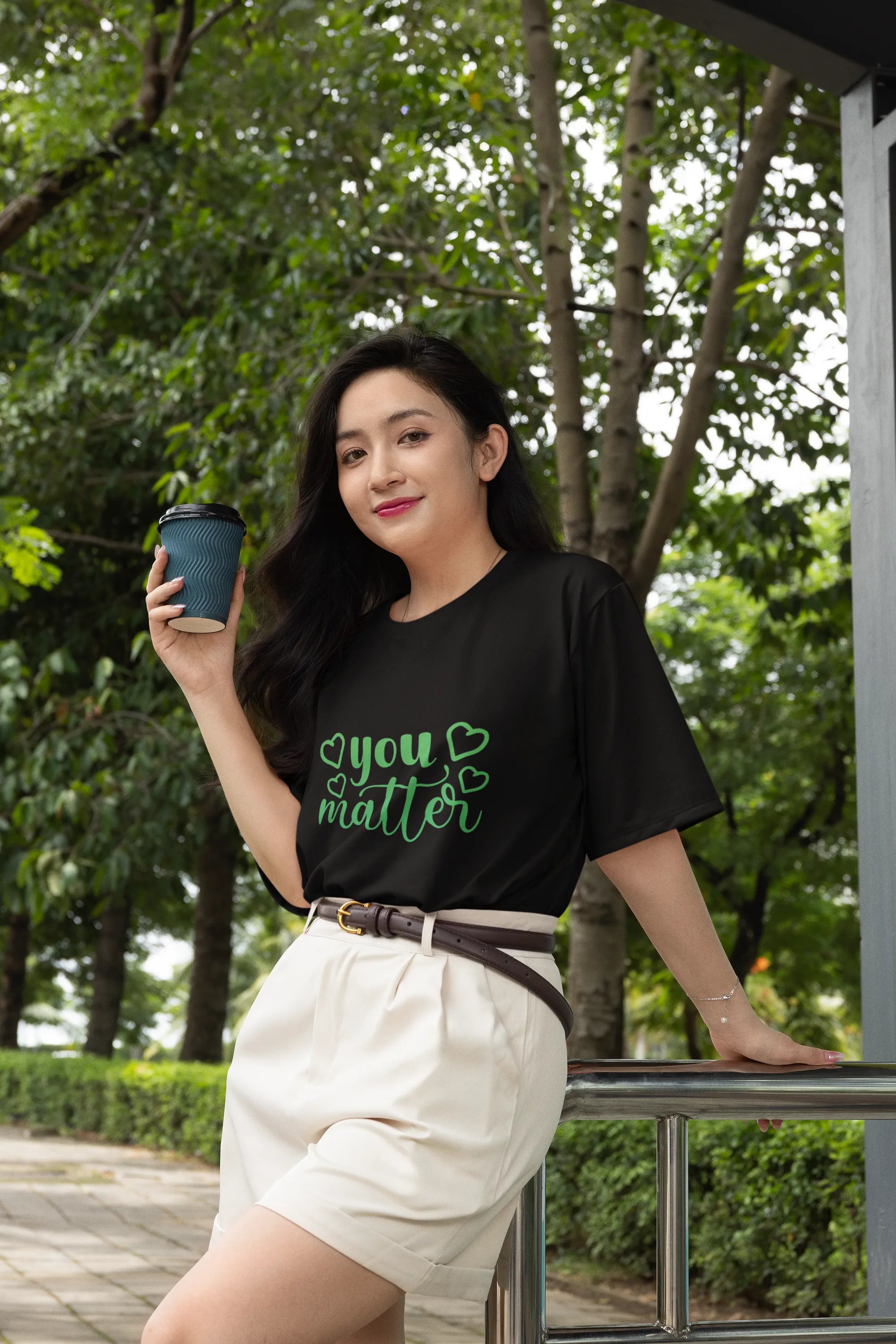 A minimalistic T-shirt design featuring the phrase "You Matter" in elegant, bold typography. The words stand out with a soothing color palette, possibly pastel or monochrome. Subtle artistic elements like a heartbeat line or stars enhance the uplifting message.