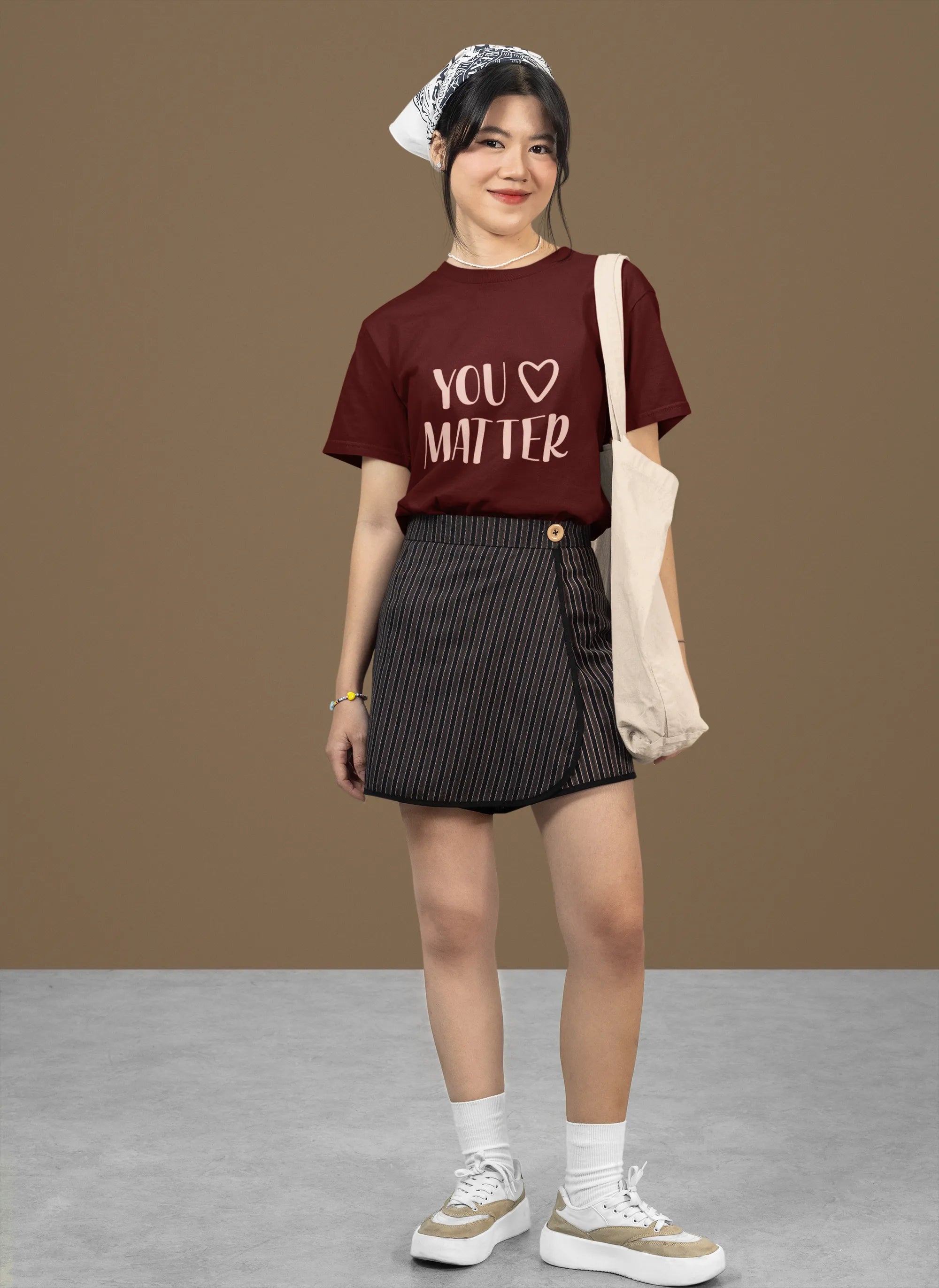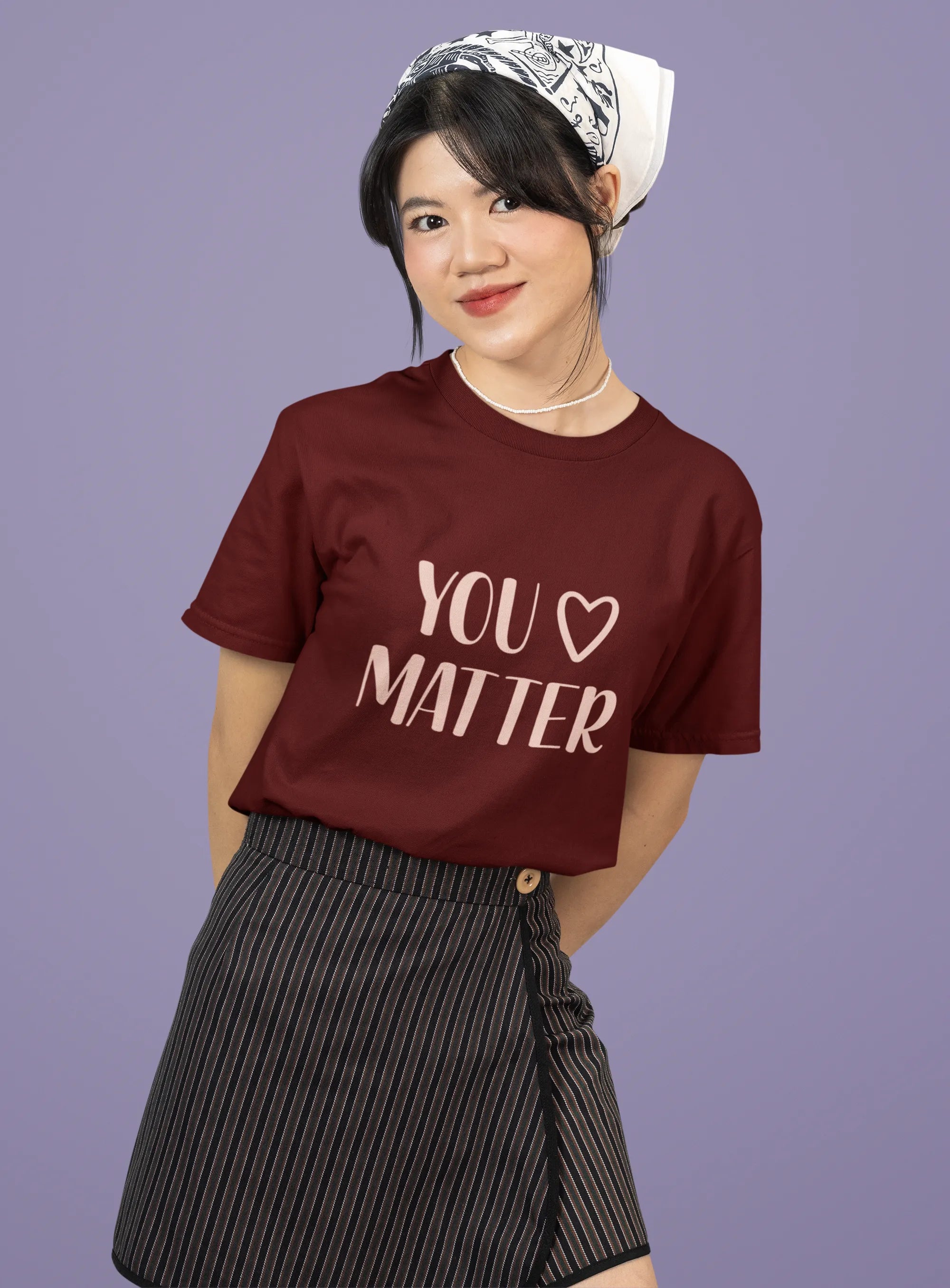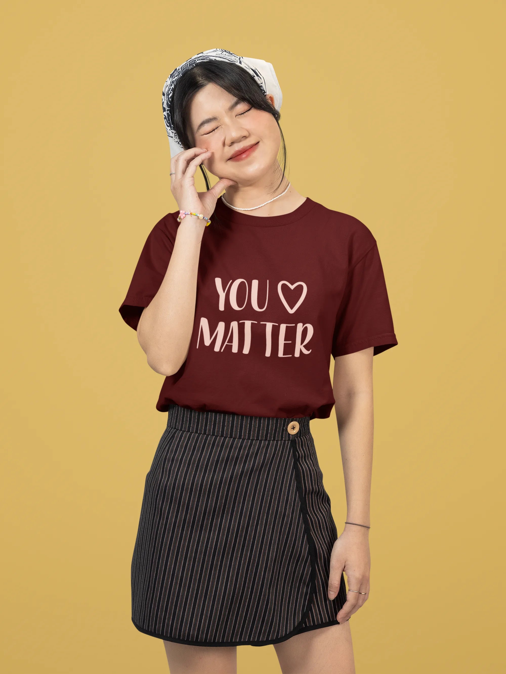 A bold and uplifting T-shirt design featuring "You Matter" in an elegant, modern font. The text is highlighted with a heart, glow, or minimalist underline for emphasis. Soft, neutral, or vibrant colors enhance its empowering message, spreading positivity and self-worth.