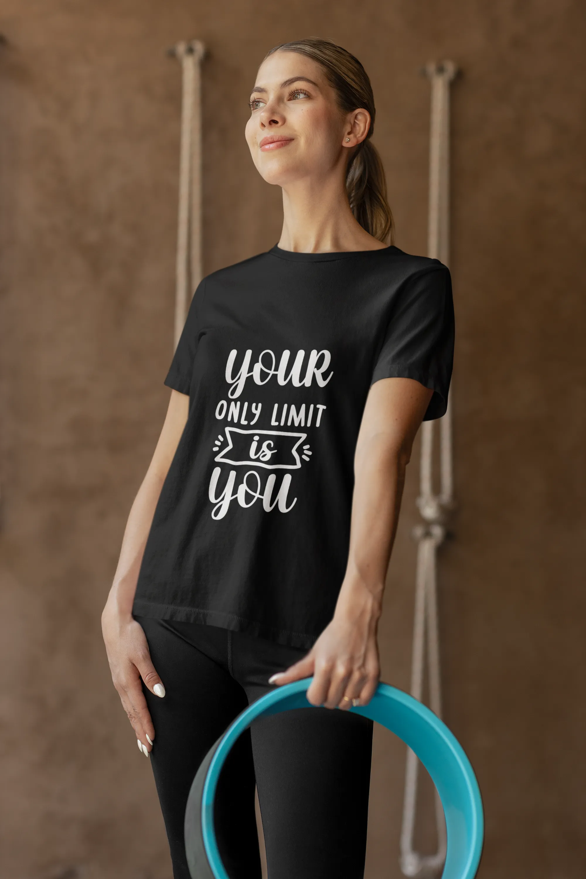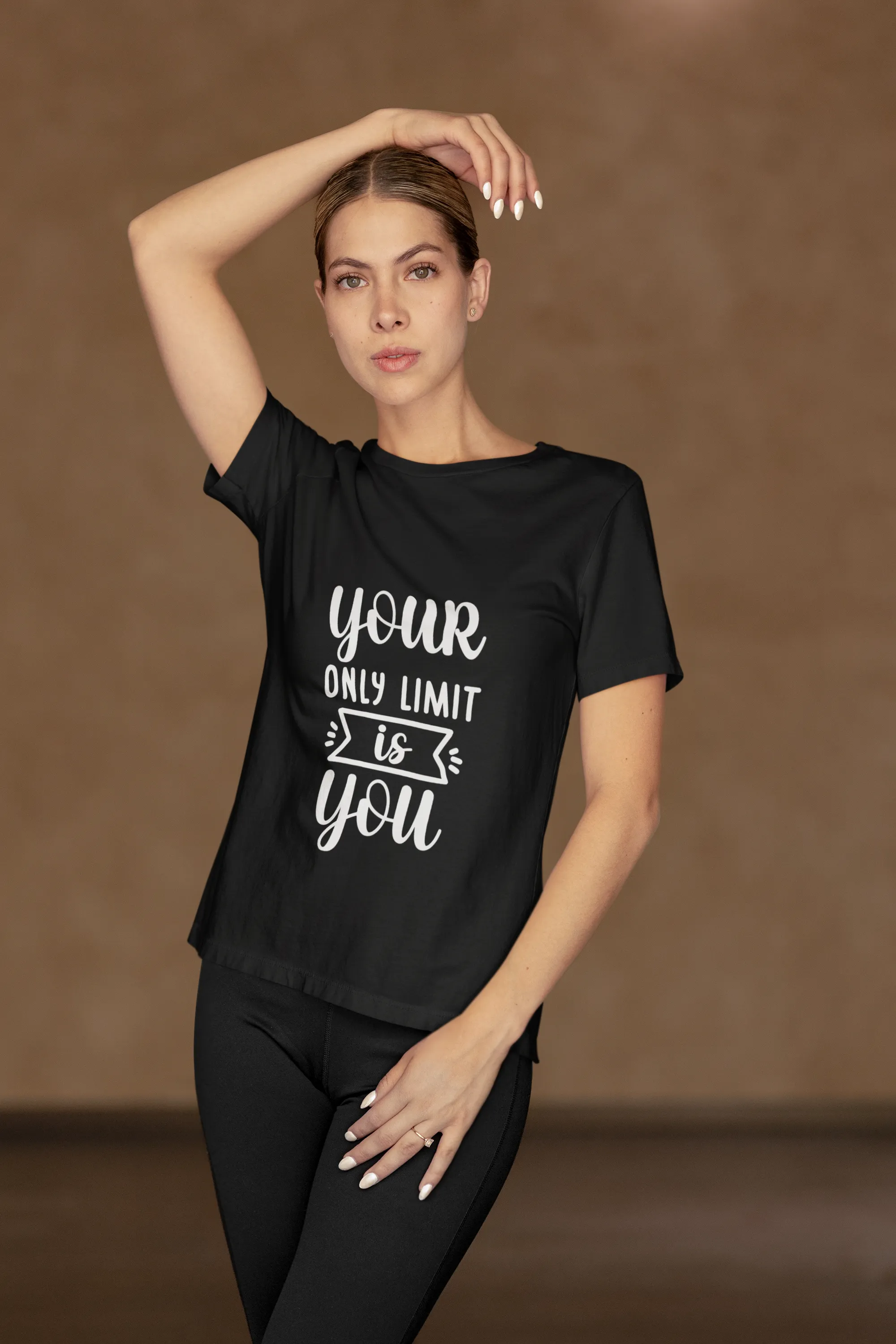 A minimalist T-shirt design featuring the motivational quote "Your only limit is you" in bold, modern typography. The text is creatively arranged with dynamic strokes or a gradient effect, complemented by subtle abstract elements for an inspiring and stylish look.